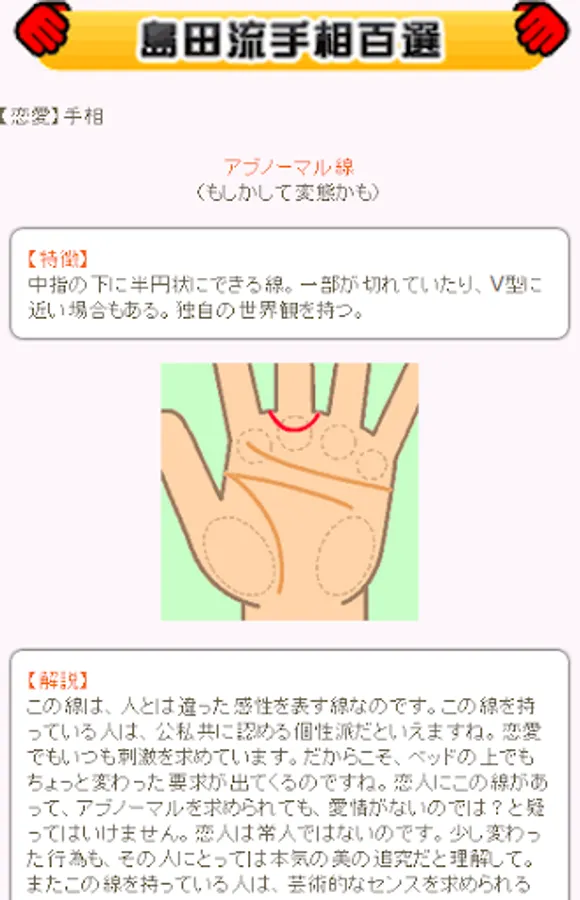 このアプリでは、そんな独特な手相を100種以上盛り込み、