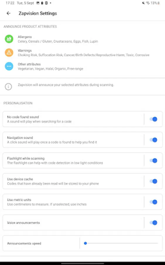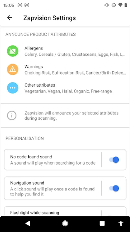 Accessible QR codes scanned via the app at first allow blind and partially sighted people to understand the distance and category of the product from their device once detected. The user is then guided to access all the product information related to the specific product presented to them using their device's configured accessibility features, including text-to-speech, VoiceOver and font settings.