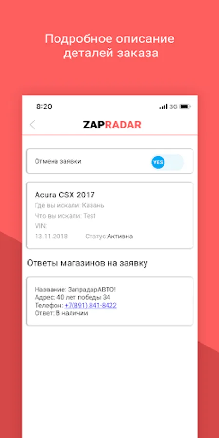 Autoshops promptly respond to your request, using special interfaces, autoshops specialists check the relevance of the availability of parts in the store's warehouse and tell you the actual price. After that, the answer from the store will come to you via the most convenient communication channels: by email, by SMS or directly to the application interface using PUSH notifications. You can see the answers from auto shops and cancel the application (in case you have already found a spare part for your car) in the app.