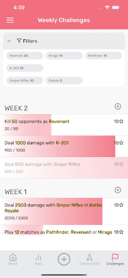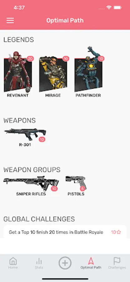 The unofficial Apex Legends companion app for tracking stats and chasing heirloom shards. Track your weekly challenges, and use Optimal Path to guide you towards your most lucrative choices. Graph and map your stats, and keep track of your numbers as you fight. Keep tabs on your progress toward your next heirloom shards, and challenge yourself with extra challenges.