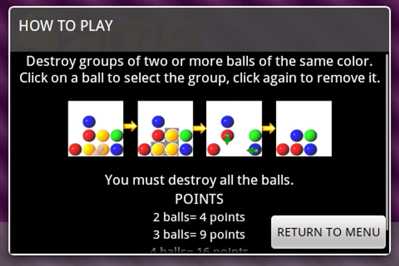 Same Bubbles is a match-2 funny game, the player must destroy all balls on the screen, when there are groups of two or more adjacent balls of the same color, you can destroy them.