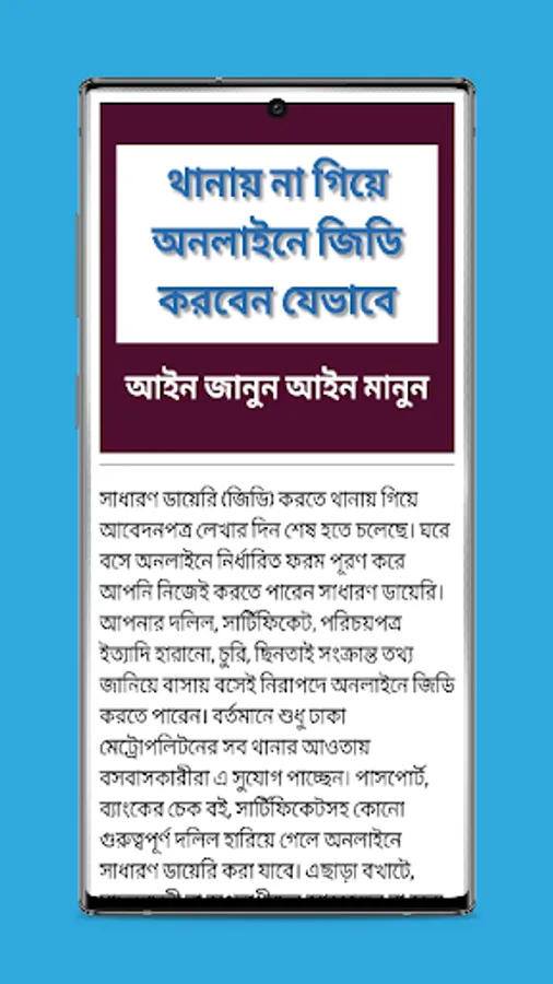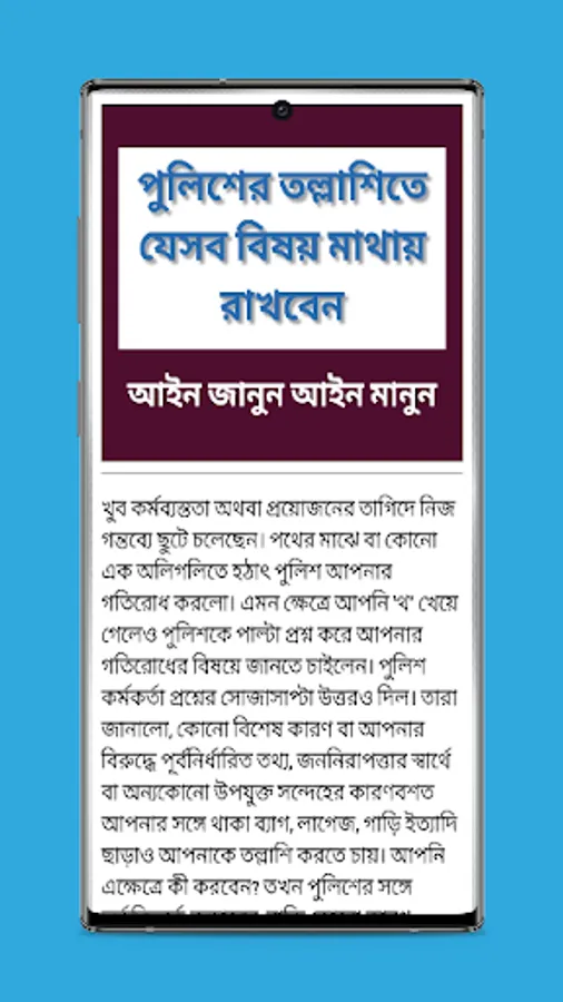 আইন জানার গুরুত্ব ও প্রয়োজনীয়তা সম্পর্কে বলা হয়, Ignorance of Lwa is no excuse- অর্থ্যাৎ আইন না জানা কোনো অযুহাত হতে পারে না। আবার আইন না জানার অযুহাতে কৃত অপরাধ হতে মাফও পাওয়া যায় না। সুতরাং দেখা যাচ্ছে, একটি দেশের নাগরিক হিসেবে ওই দেশের প্রচলিত আইন-কানুন সম্পর্কে জানা প্রত্যেকেরই দায়িত্ব-কর্তব্য। মূলত এ উপলব্ধি থেকেই ‘আইন জানুন-আইন মানুন’ অ্যাপটি তৈরি করেছেন ডেভলপার। সমাজ ও বাস্তব জীবনে প্রয়োজনীয় ফৌজদারি প্রকৃতির বিভিন্ন আইন-কানুন সম্পর্কে আলোকপাত করা হয়েছে। সমাজ ও বাস্তবজীবনে প্রয়োজনীয় দেওয়ানি প্রকৃতির বিভিন্ন আইন-কানুন বিষয়ে। বাংলাদেশের আদালত, ট্রাইব্যুনাল এবং সংবিধানে উল্লিখিত মৌলিক অধিকার বিষয়সমূহ নিয়ে। প্রশ্ন-উত্তরের মাধ্যমে আইন জানা এবং আমাদের দৈনন্দিন জীবনে বহুল ব্যবহৃত আইনবিষয়ক কিছু ইংরেজি শব্দের অর্থসহ ব্যাখ্যা দেয়া হয়েছে। পাশাপাশি দেশের নাগরিক নাগরিক সমাস্যার কথা মাথায় রেখে এবং এ সব নাগরিক সমস্যা কিছুটা হলেও লাঘবকল্পে নাগরিক সেবা বিষয়ক প্রয়োজনীয় বিভিন্ন বিষয় নিয়েও আলোচনা করা হয়েছে অ্যাপটিতে। অ্যাপটির শেষ ভাগে বিশ্বের বিভিন্ন দেশের হাস্যকর ও মজার মজার আইন, বিভিন্ন দেশে দেহ ব্যবসার বিচিত্র আইন, আইনবিষয়ক কৌতুক, বিখ্যাত ব্যক্তিদের উক্তি এবং প্রয়োজনীয় কিছু ওয়েবসাইট ও লিঙ্ক উল্লেখ করা হয়েছে। অ্যাপটির বিভিন্ন ভাগে উল্লিখিত বিষয়সমূহ পাঠের মাধ্যমে পাঠক-পাঠিকাবৃন্দ সহজেই আইনের বিভিন্ন বিষয় সম্পর্কে জ্ঞাত হওয়াসহ বিশেষভাবে উপকৃত হতে পারবেন বলে আশা করা যায়। আইন সম্পর্কে শুধু জ্ঞানার্জন বা জানা বড় বিষয় নয়, বরং আইন জানার পাশাপাশি আইন মান্য করাই হচ্ছে বড় বিষয়। সুপ্রিয় পাঠক-পাঠিকাবৃন্দ এই অ্যাপটির মাধ্যমে বিভিন্ন আইন সম্পর্কে একদিকে যেমন জানতে পারবেন, তেমনি অপরদিকে তারা আইন মান্য করতেও উদ্বুদ্ধ হবেন।