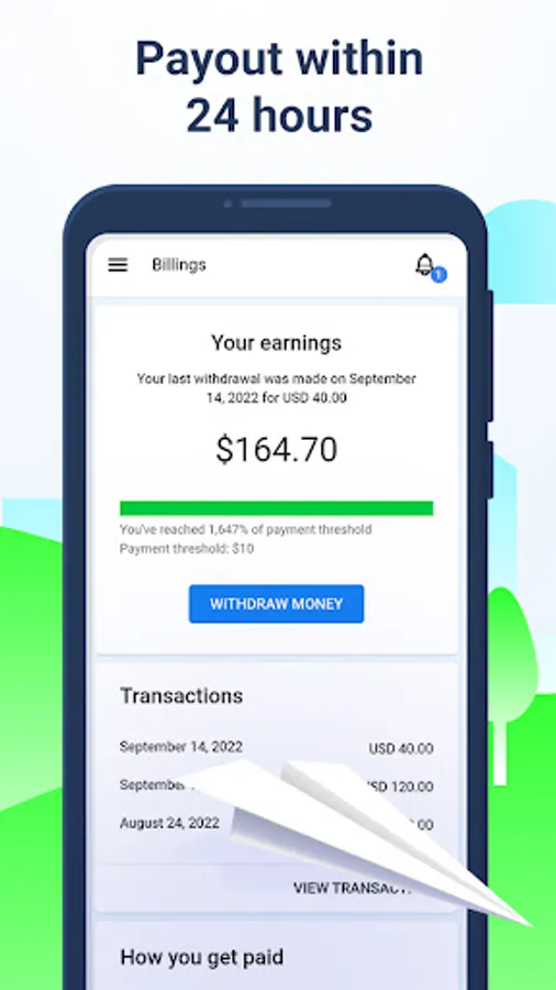 Available withdrawal methods are: Bank transfer and PayPal. The minimum withdrawal amount is $10. You will receive the funds within 24 hours.