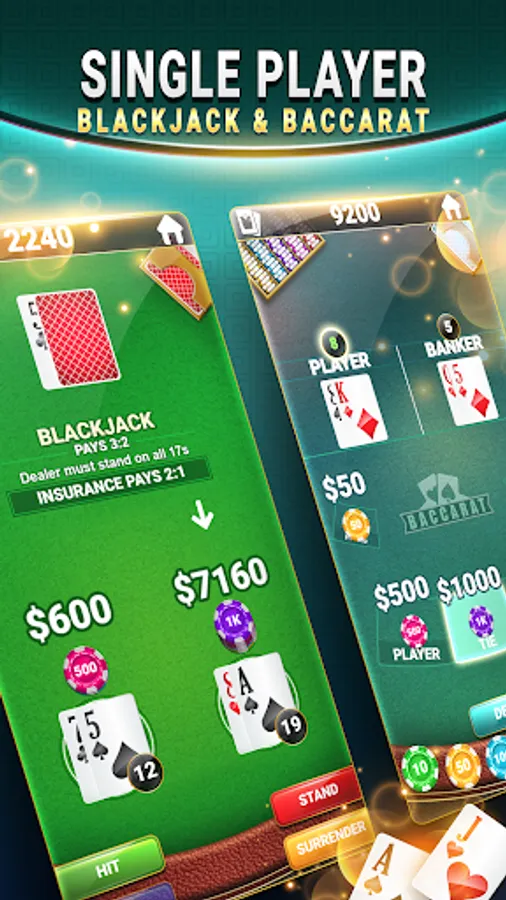 Learn to play the casino card game Blackjack and Baccarat on mobile for FREE! Receive a daily token bonus for you to try your luck every day! Blackjack & Baccarat offers you the opportunity to play casino Baccarat according to the classic Vegas rules and 4 variants of Blackjack, Classic Blackjack, Blackjack free Bet, Blackjack Lucky Lucky and Blackjack Switch!