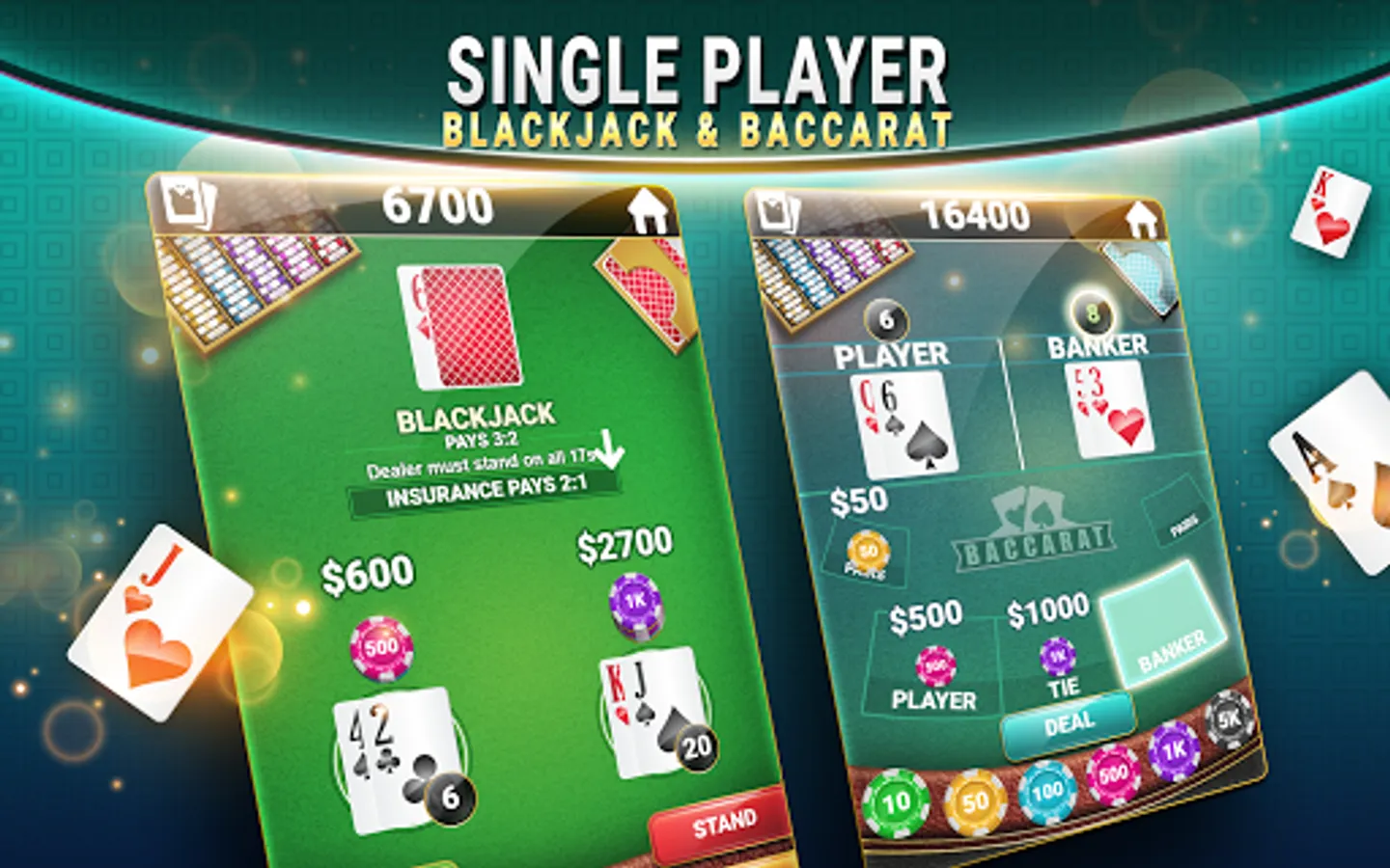 Share the passion and enthusiasm of millions of players from all over the world and play the best Free Blackjack 21 game. Your experience as a Blackjack and Baccarat player is not that important. Jump in and feel the thrill of a real casino atmosphere, where your luck and skills will be tested to the limit in Blackjack & Baccarat!