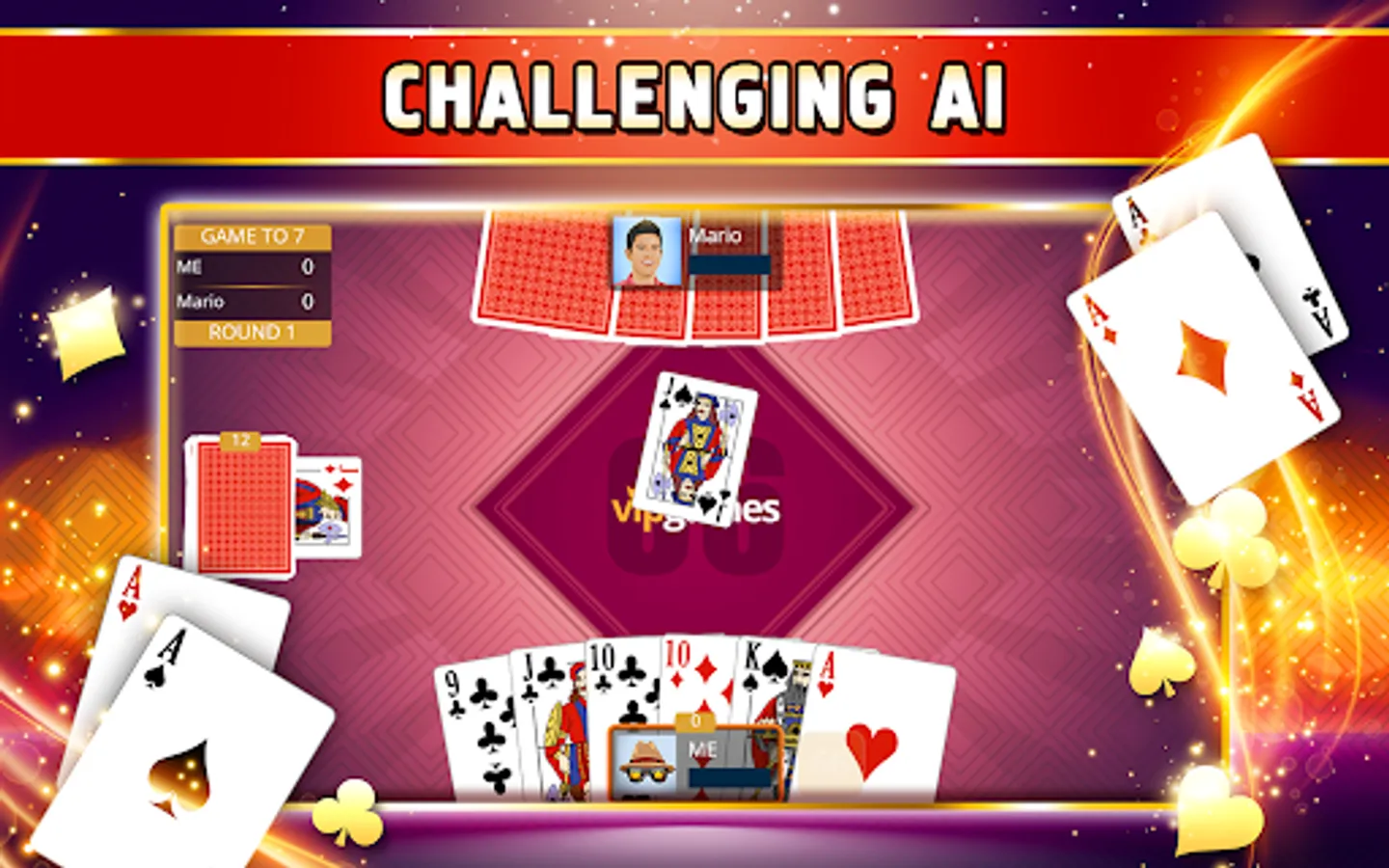 Sixty-Six Offline is a challenging classical trick-taking card game and is played with a deck of 24 cards. The card ranking is as follows: A, 10, K, Q, J, 9. High concentration and thinking levels are required to be successful and for this reason, Sixty-Six is known as one of the best card games for two players.