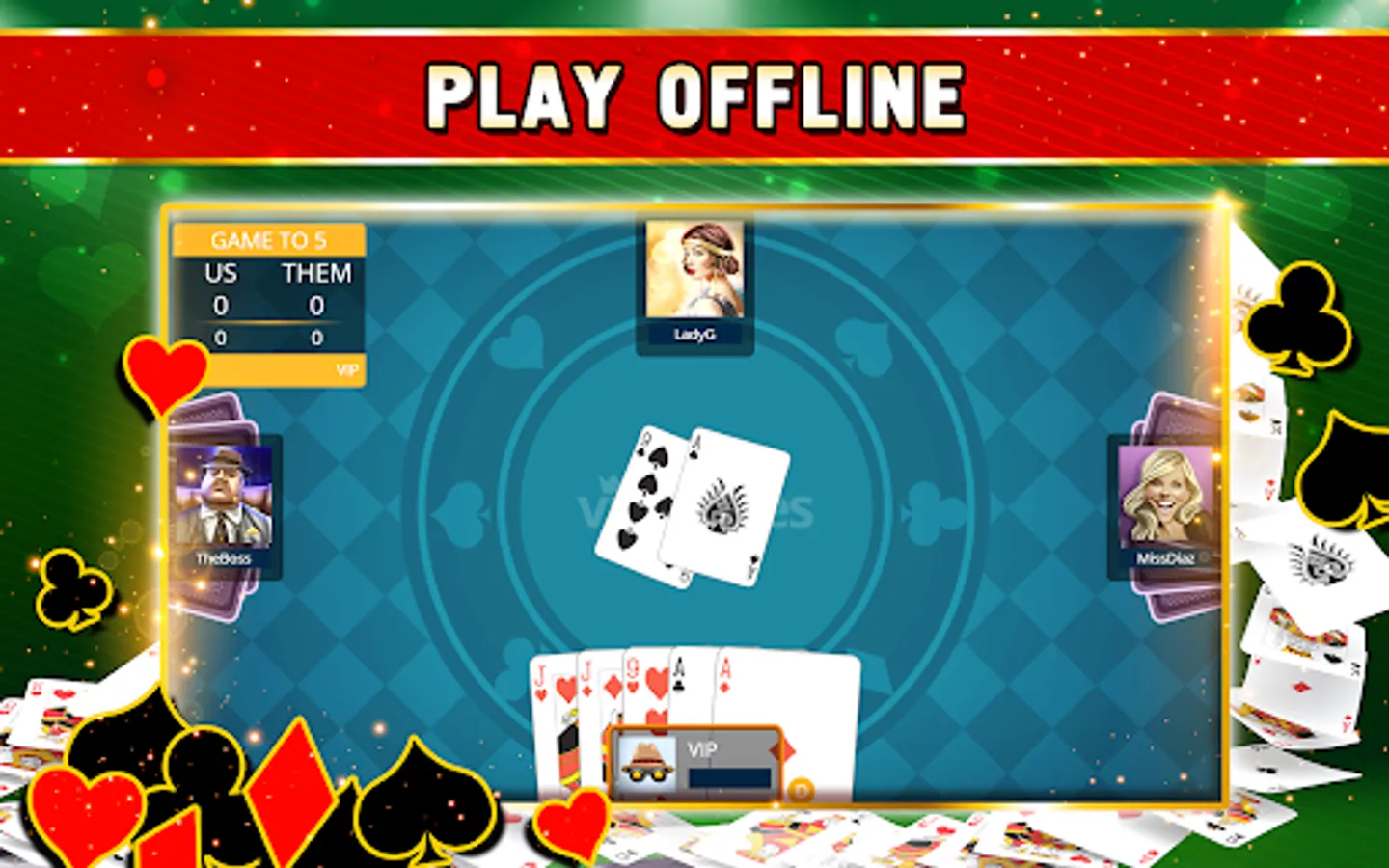 This classic card game is played by two teams of two people each, so with our Euchre Offline you will compete against our expert bots. In our Euchre single player card game a standard deck of 24 cards is used, consisting of A, K, Q, J, Ten, Nine of each of the four suits. Our app also has a game mode of playing with a game deck of 32 cards. When the players are in teams, they choose the trump suit, and try to win more tricks than the other team.