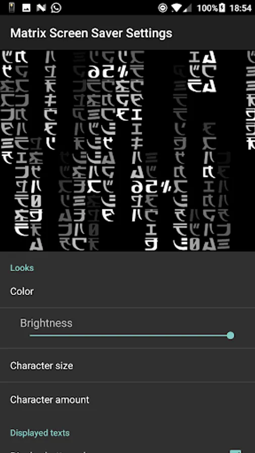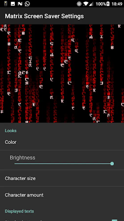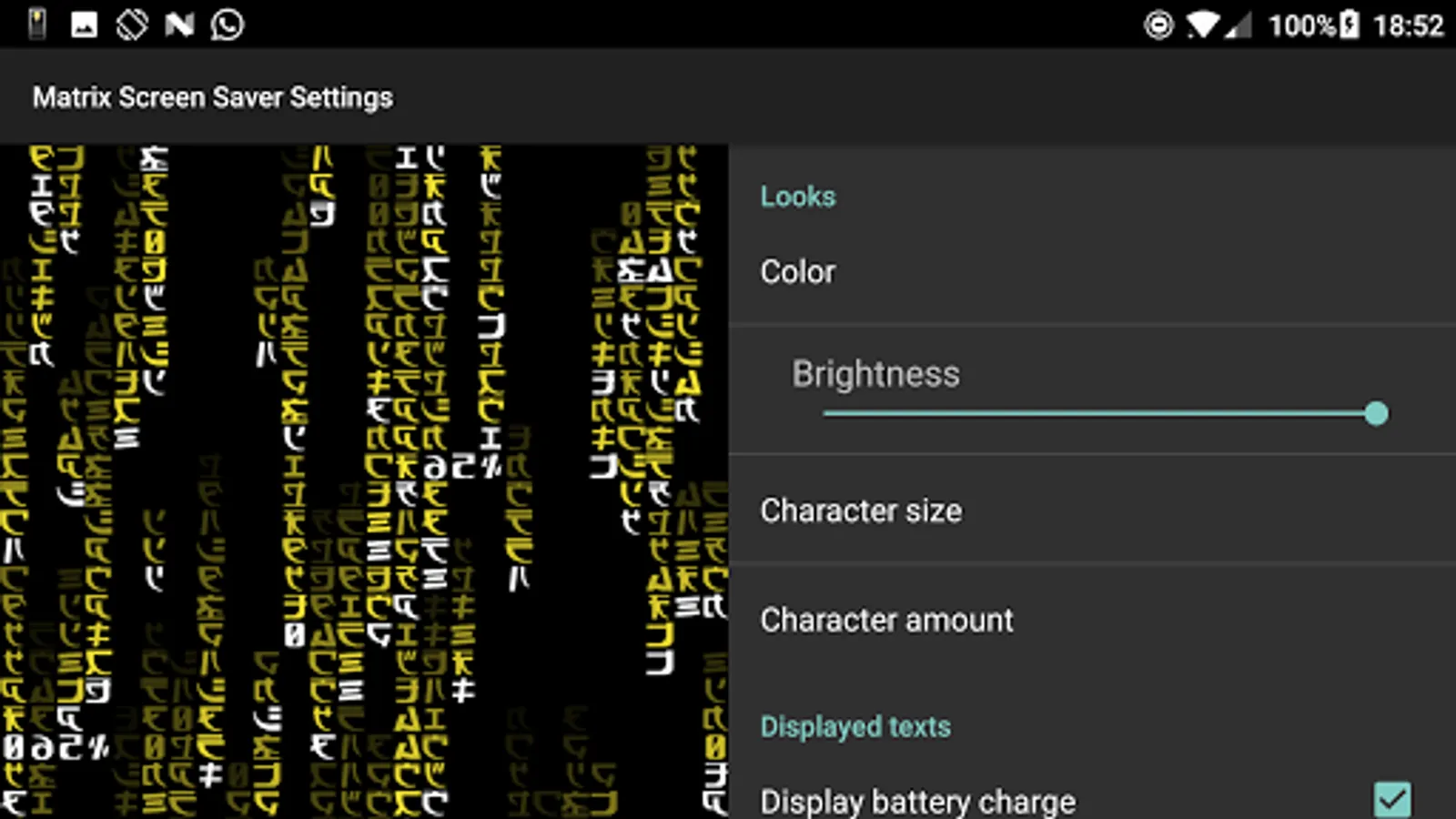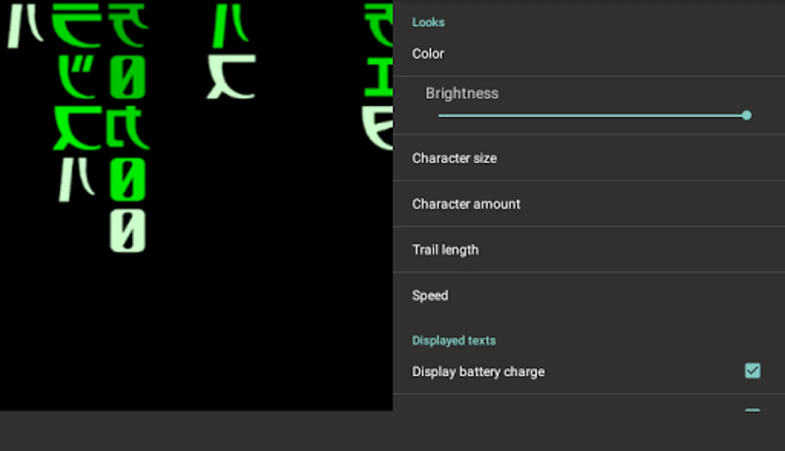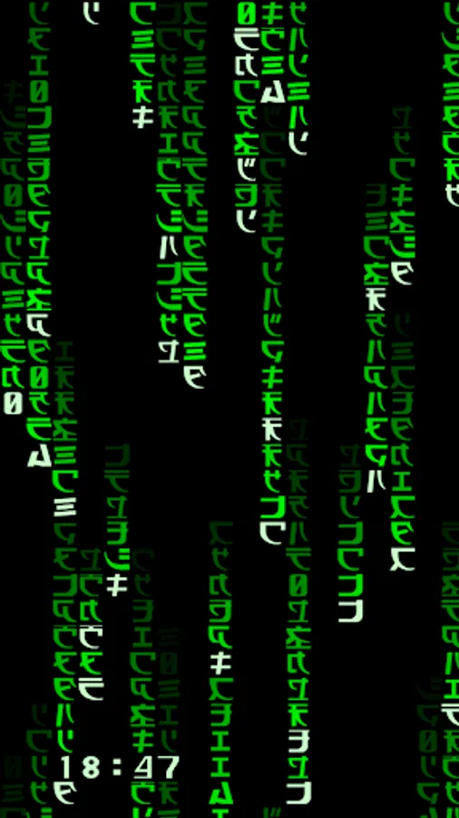 Screen saver for Android of Matrix code from the movies. Battery charge level and clock time will be displayed as the text falls similar to the movie intros.
