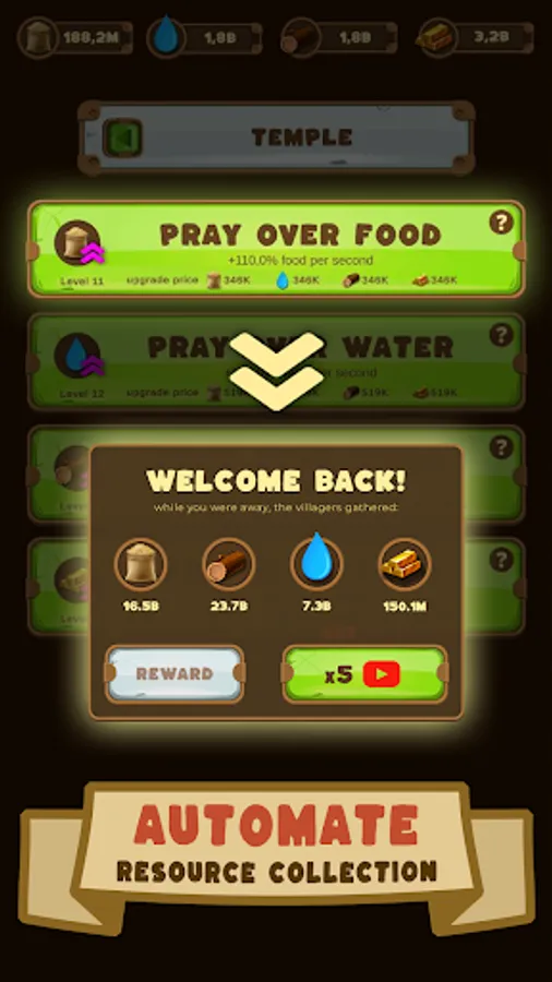 — Collect 4 type of resources: food, wood, water, and gold to build and improve the constructions and increase village clicker power.