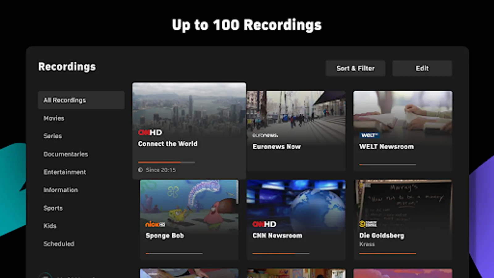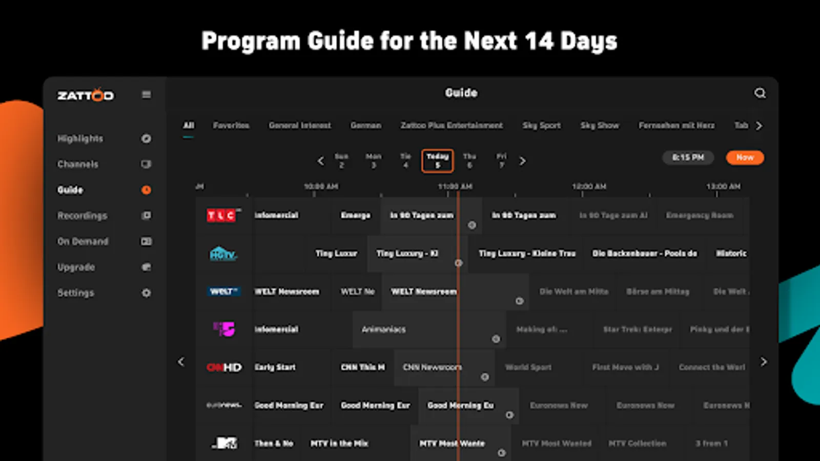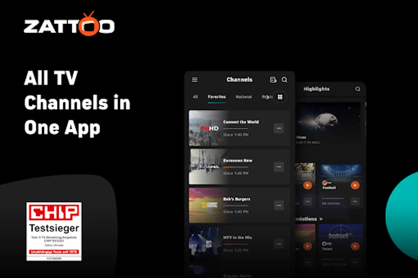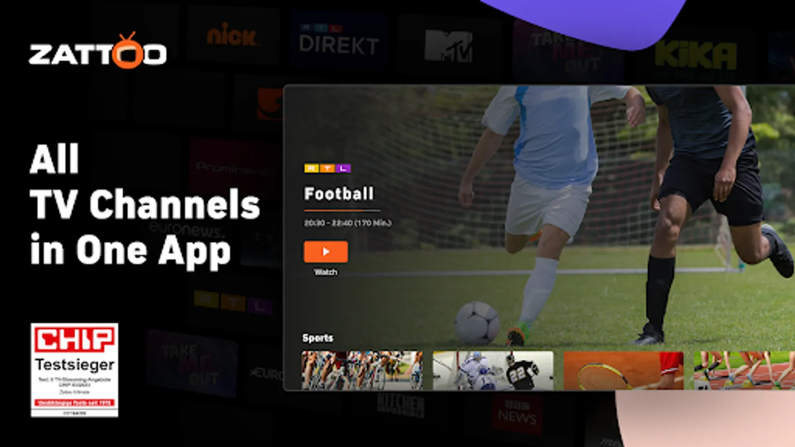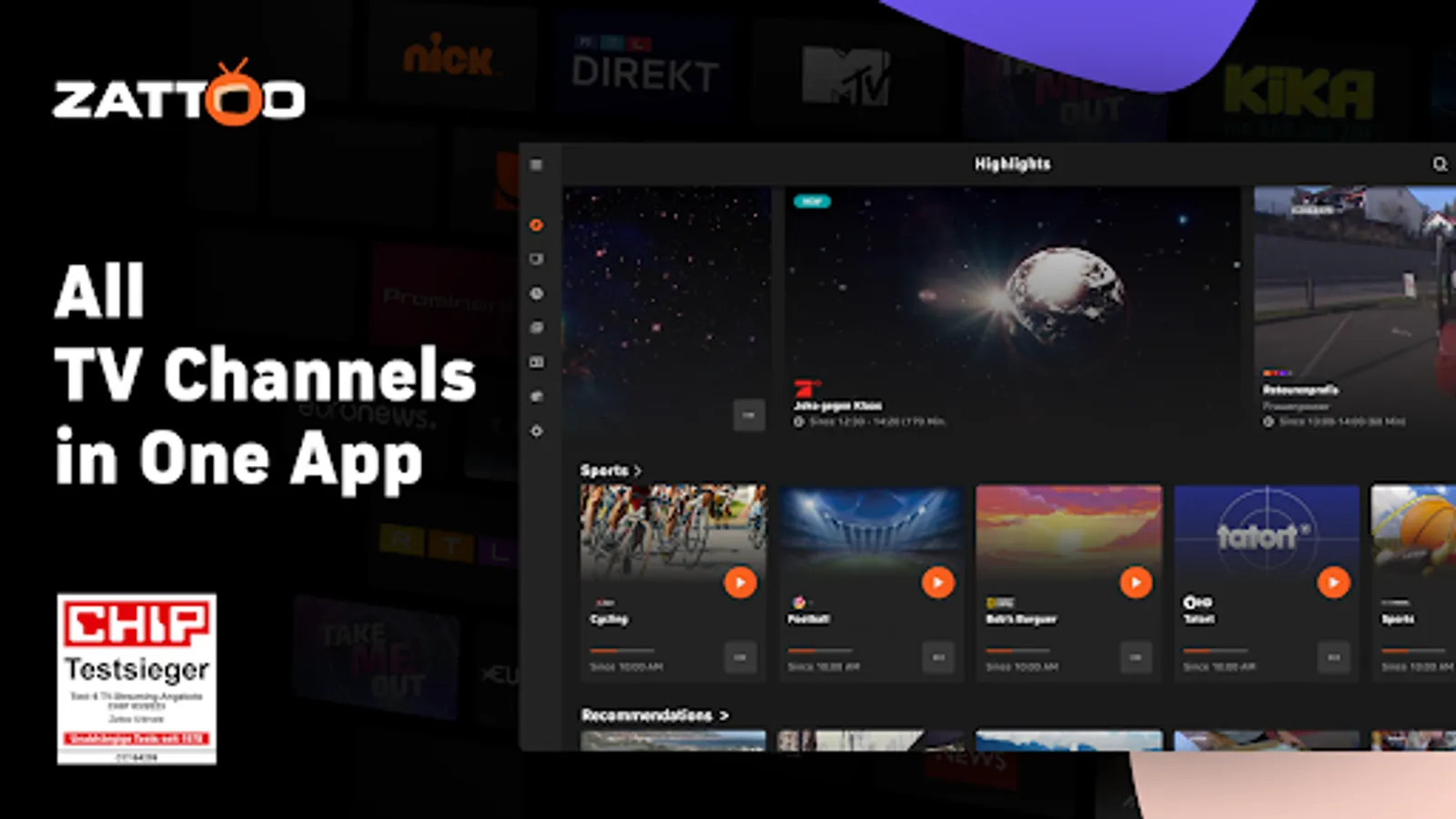 Watch blockbusters, series, live sport, exciting documentaries, and entertainment at home on your smart TV or away on your smartphone. With Zattoo you can access TV anywhere with internet. Free yourself from cables and satellites and try the television of the future with the test winner for image quality.