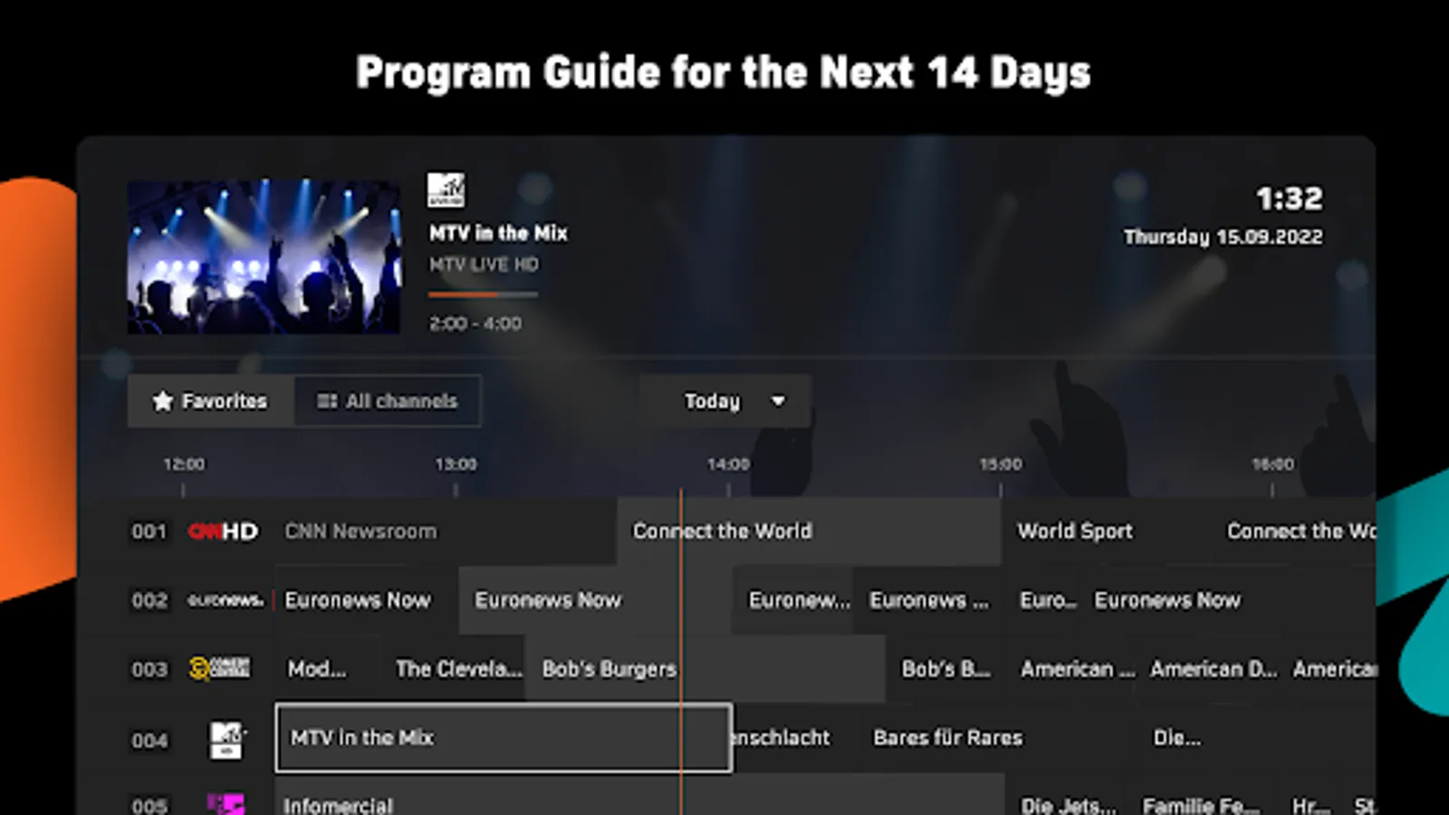 • Sports and special interest channels such as Eurosport, Sport1, Tele 5, WELT, HGTV, DMAX, TLC....