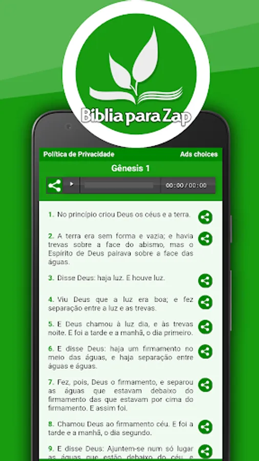 Verses to share – Allows you to share verses segregated by theme such as: love, faith, rest, deliverance, prayer, forgiveness, salvation, etc.;