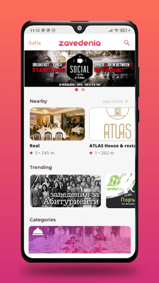 Zavedenia application will show you closest venues around you and all offers that are currently posted by the venues. You can also find venues by different categories and areas in the city you are currently in.