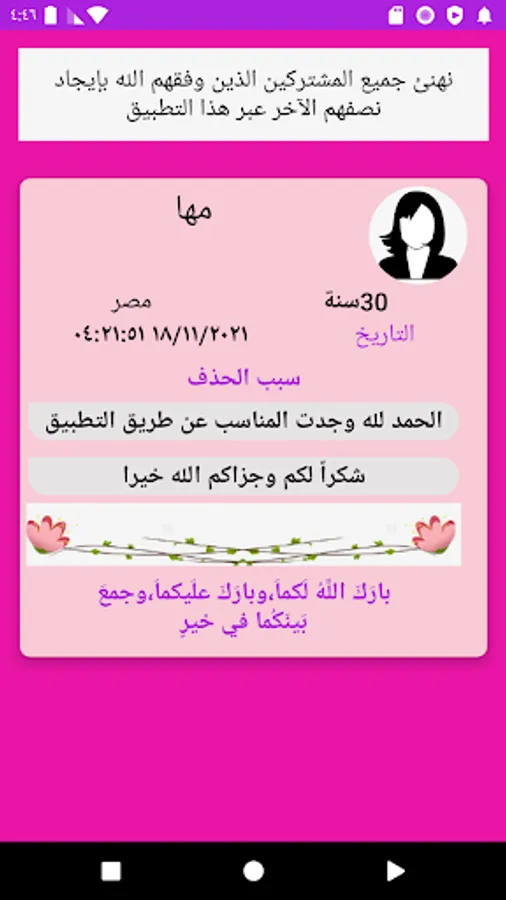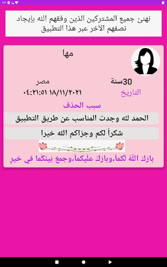 The "Marriage of Girls and Divorced Egyptians" application is distinguished from other online marriage applications in that it takes care of the smallest details that care about your privacy and finds you the right person in a smart way to make its use a safe and reliable experience, and it is also based on compatibility, which means that its customized results agree between you and your potential future partner