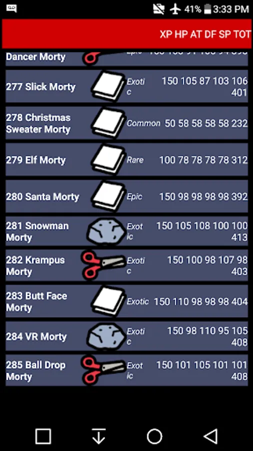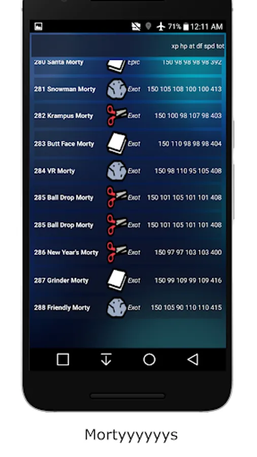 +MORTYPEDIA has all the statistics on every morty. (hp, attack, defense, speed..)