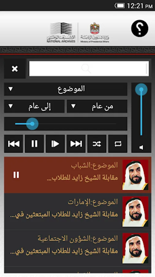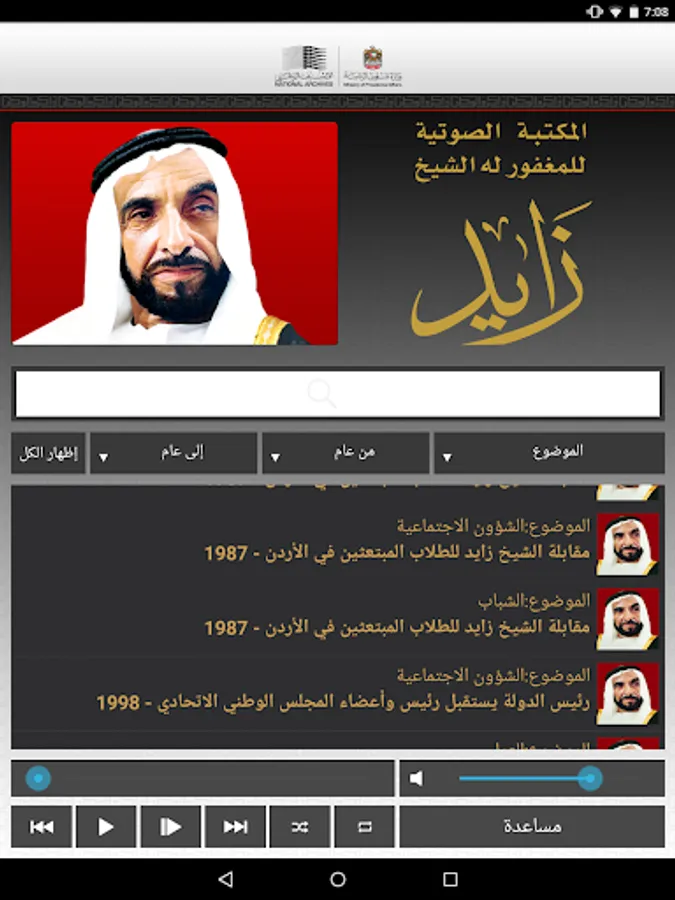 The National Archives of the UAE launched an Audio Library of the founding leader the late sheikh Zayed bin Sultan Nahyan. It includes hundreds of audio recordings of Sheikh Zayed addressing various local, Arab and international cases. This comes within the interest in the history of the UAE and its leaders who created its glory and civilization. The National Archives seeks to make its documented Memory of the Nation acquisitions and treasures available to researchers and users in the audio form to recall the warm fatherly voice of the founding father Sheikh Zayed bin Sultan Al Nahyan.