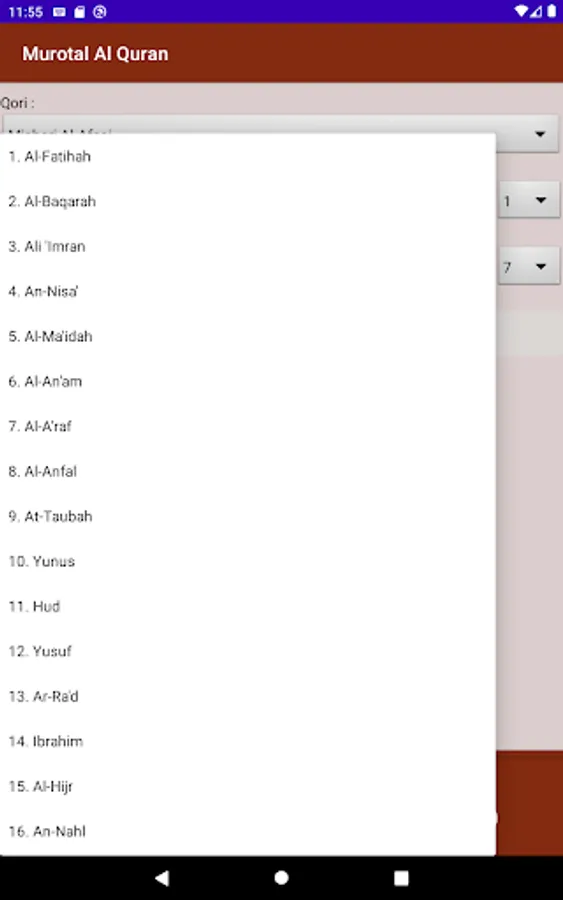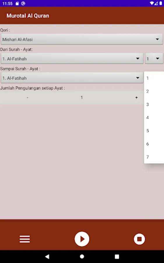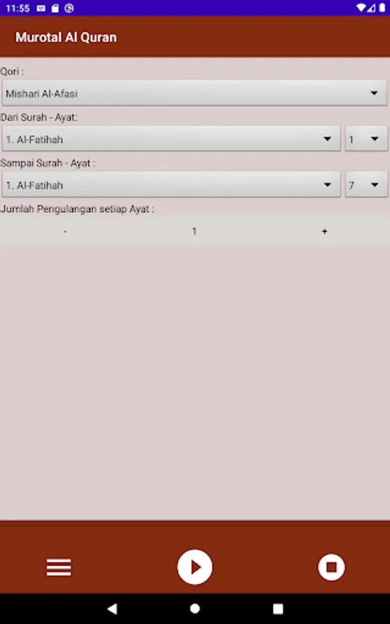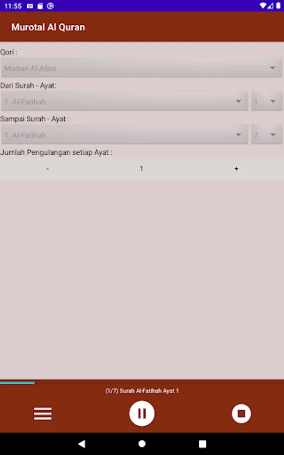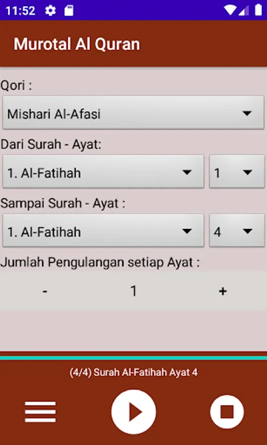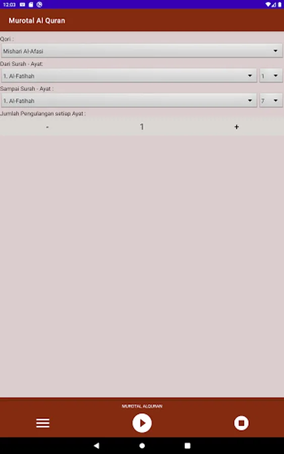 This application can play the murotal surah and verses according to the user's wishes, no need to play all the surahs, but users can choose which verse they want to play which this feature will be very helpful in memorizing Al-Quran.