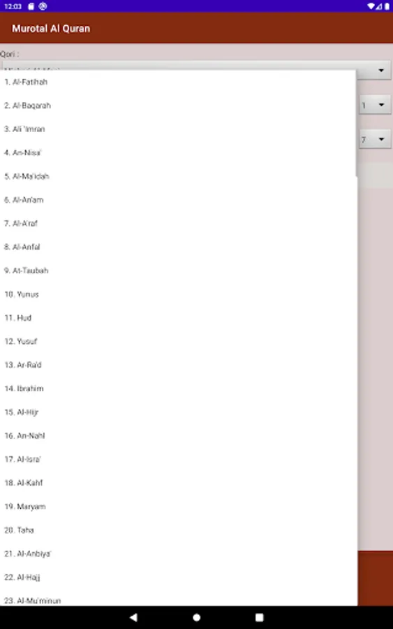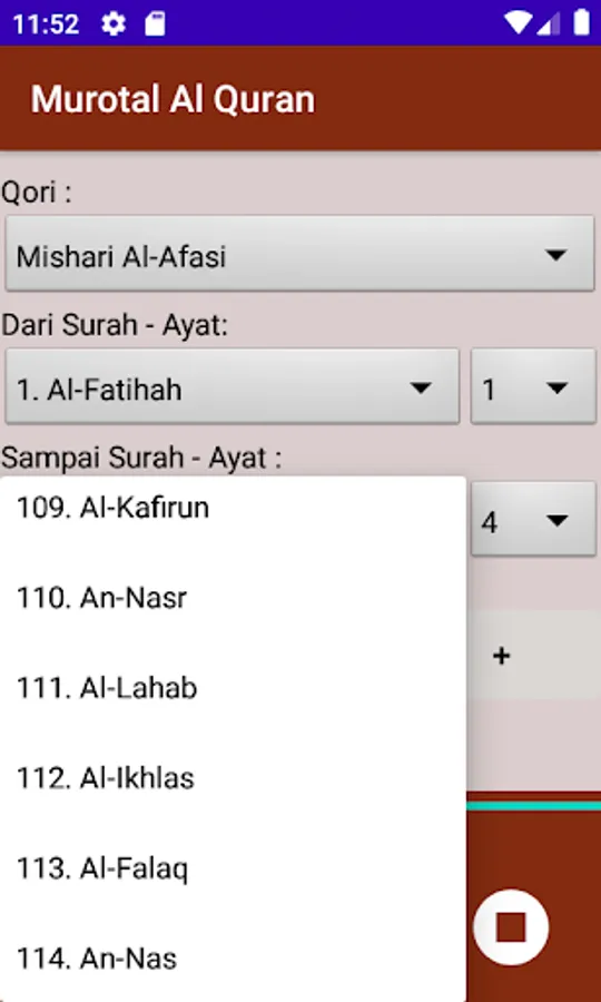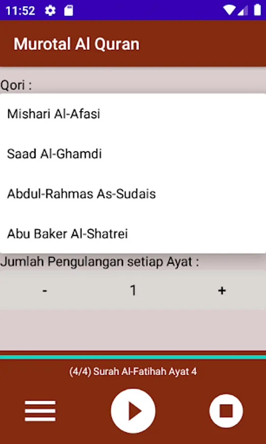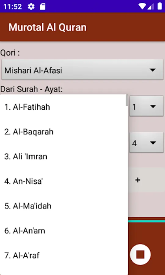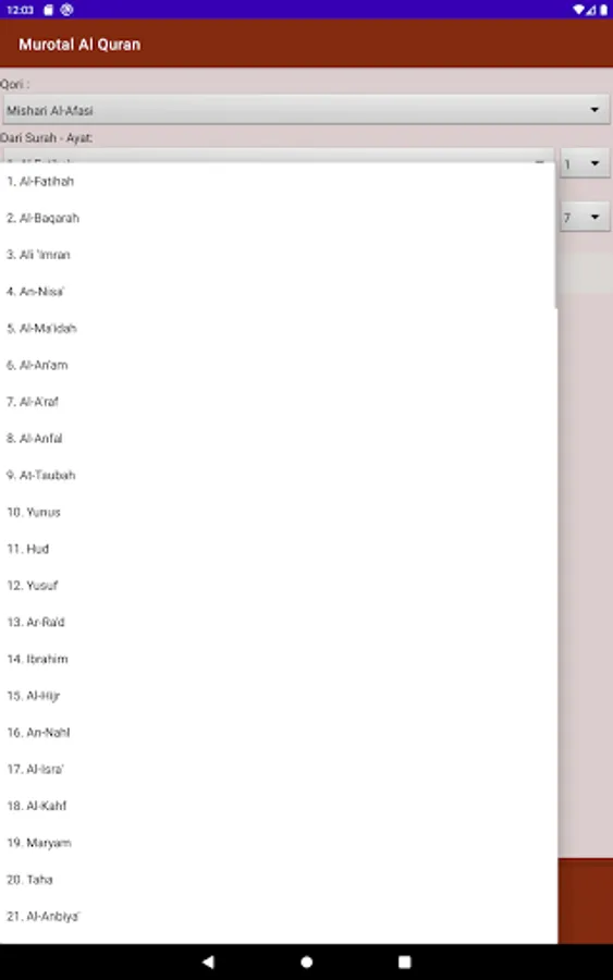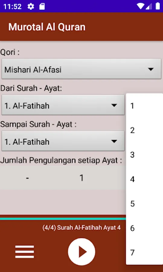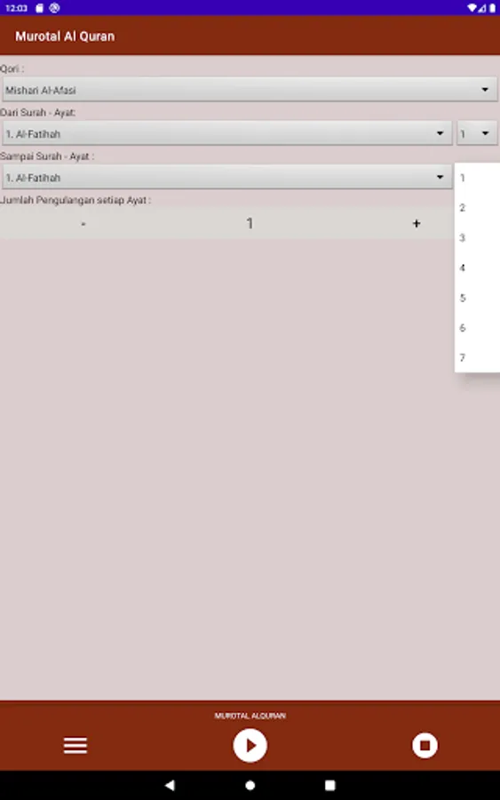 This application can play the murotal surah and verses according to the user's wishes, no need to play all the surahs, but users can choose which verse they want to play which this feature will be very helpful in memorizing Al-Quran.