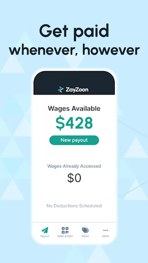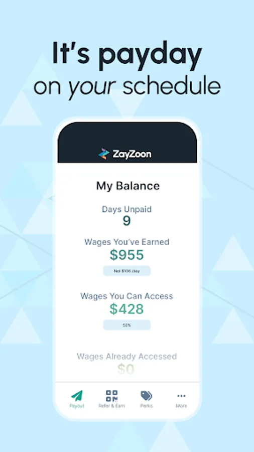 Make today the new payday. How it works: Each day you work, you build up an available amount and can choose how much of your wages you’d like to receive, instantly! On your payday, you are paid normally, minus the amount you accessed early.