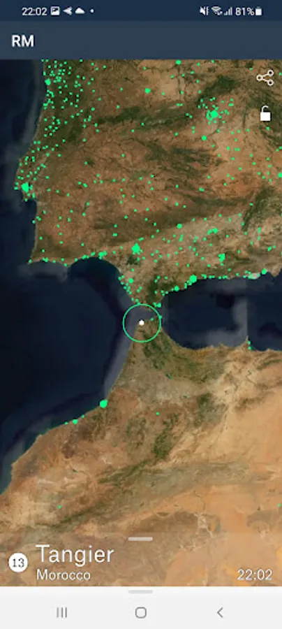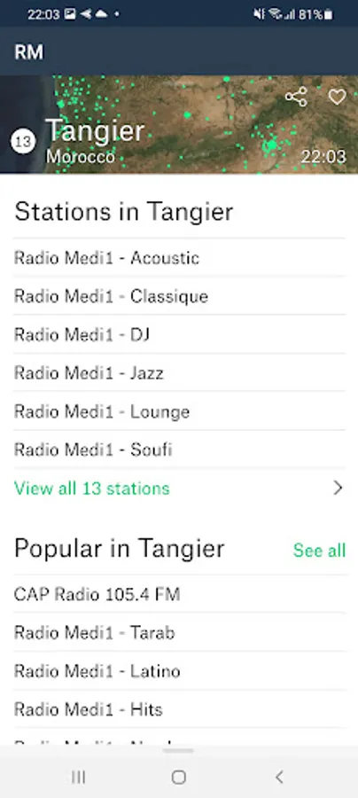 Each green dot represents a town or village. Tap it to tune to radio stations broadcasting from that city.