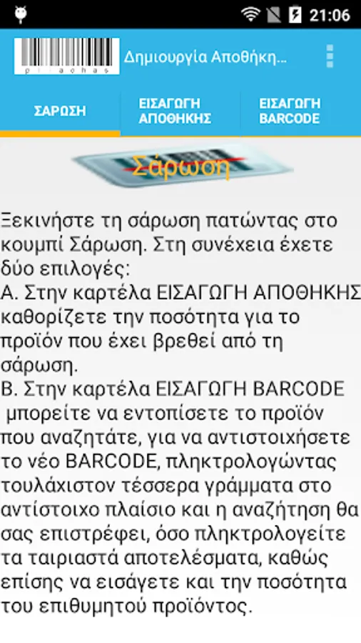 The application operation is as follows. On the first tab, (SCAN), scan the BARCODE product whose amount you want to save. If the product is in your warehouse 'IMPORT WAREHOUSE tab appears and description. It remains therefore spend the desired amount.