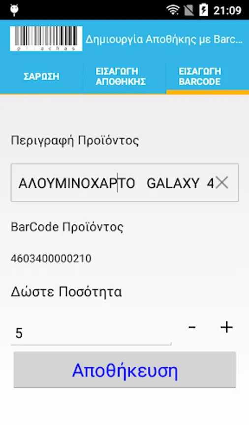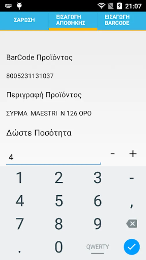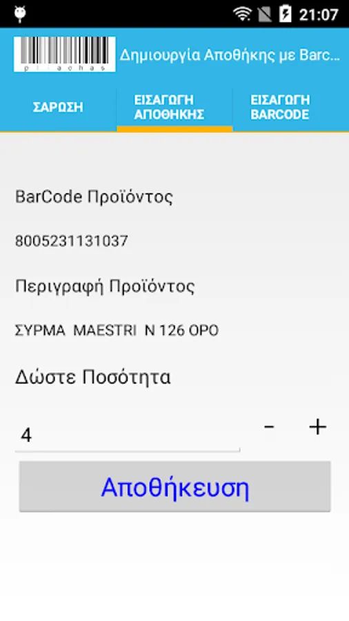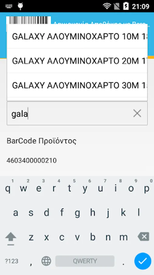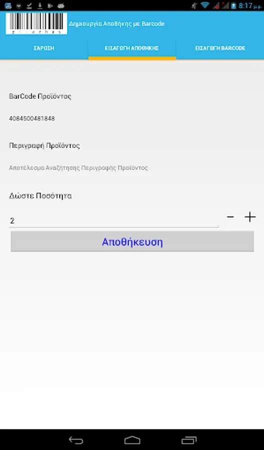 But if you have a product that has not BARCODE, or you want to assign a new one, then after you scan the BARCODE product, go to the tab 'Introduction BARCODE' and in the text box that says "contains" type at least four letters of the product which you want to assign the new BARCODE. Automatically as you type the application will display the matching results and you can select from the dropdown list the desired product. Of course apart from the correspondence of BARCODE you can specify and the amount of product you have in store.