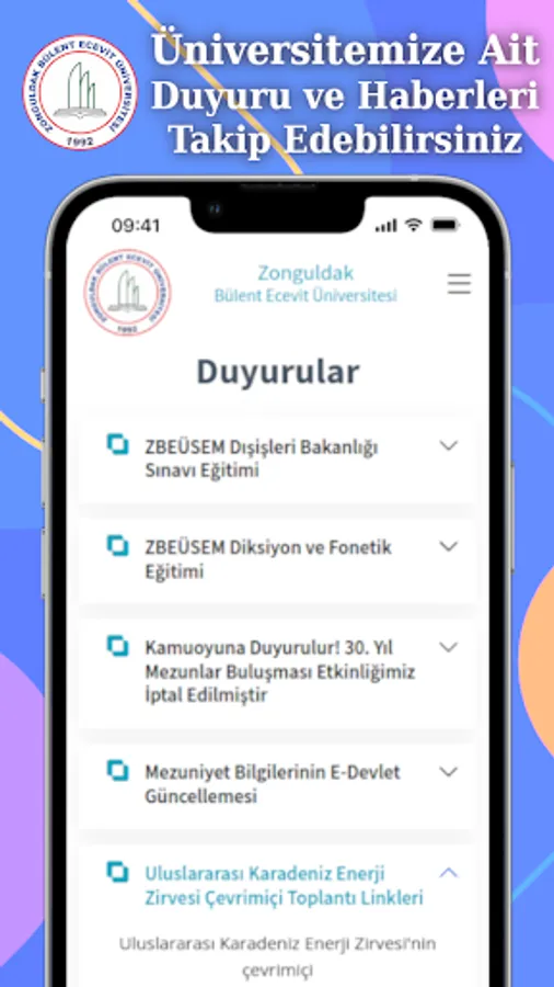 It is the official application of Zonguldak Bulent Ecevit University. You can follow news and events, and receive important announcements in the form of notifications. Don't forget to unmute your notifications.