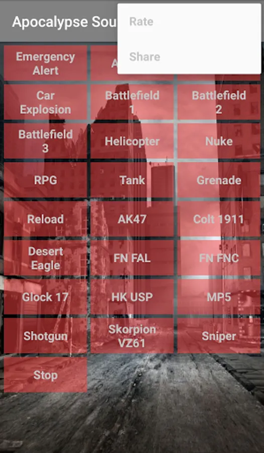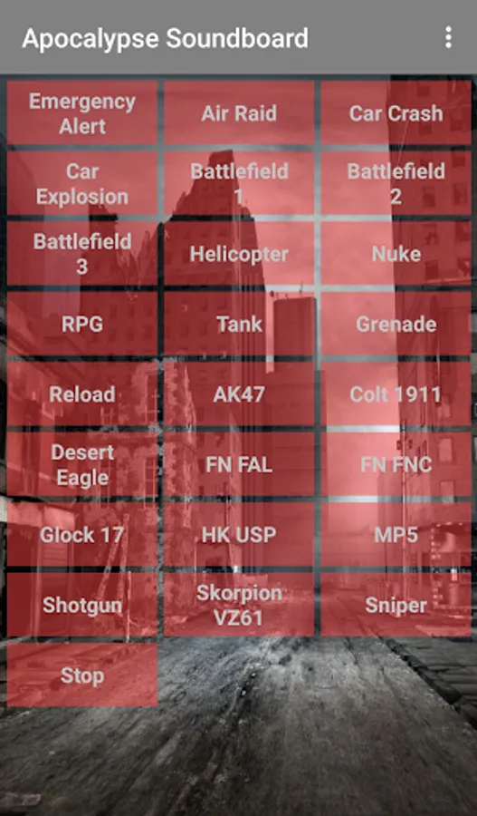 Soundboard of 24 high quality apocalyptic and war sounds. Entertainment and prank app.