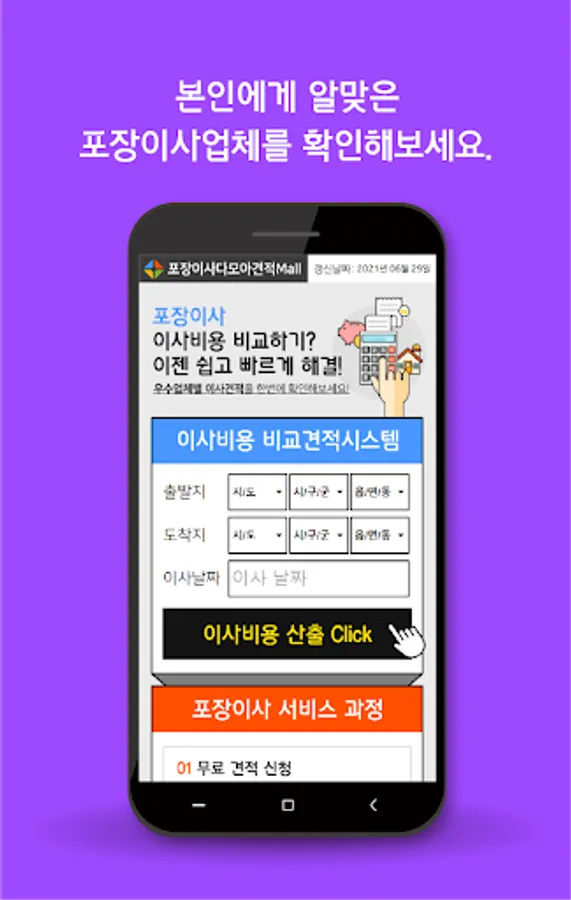 As long as there is a mobile device, it is an application that not only compares prices of packaging moving companies across the country, but also checks service quality anytime, anywhere.