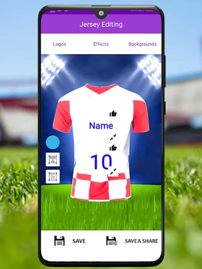 Shirt editor giving you option to write name and your lucky number on back side of shirt with your selected team logo and beautiful football ground background behind your creation trough this football jersey maker of current World Cup matches.