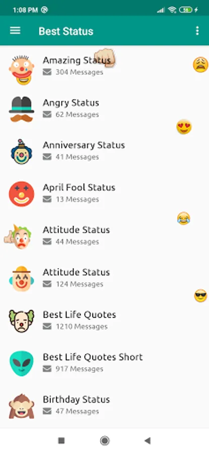 The best whatsapp status app helps you stay in touch with family and friends. Whatsapp status app is a great collection of messages and quotes. Get latest love messages/wishes/quotes/jokes from its huge categories. There is 106 status categories which gives to complete freedom to choose messages/quotes according to your mood or occasion.