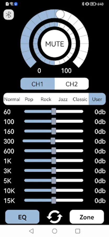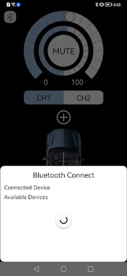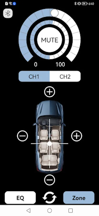 This APP adjusts the volume, turns on muting, switches modes CH1 or CH2, adjusts EQ style, customizes EQ frequency band values, and adjusts the sound range in the sound field by scanning and automatically connecting the car Bluetooth DPS audio system.