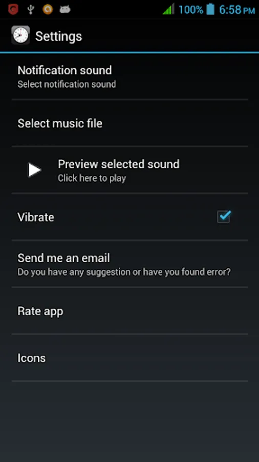 There are four available sounds in this app. Classical bell ring, aggressive chainsaw and relaxing rain and wind. Select one that fits your mood! Or you can select any mp3 file. Save timer for further use.