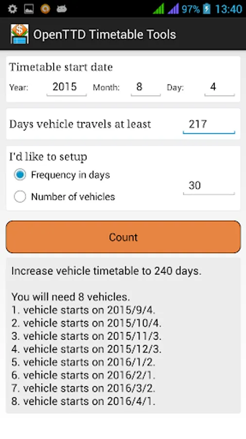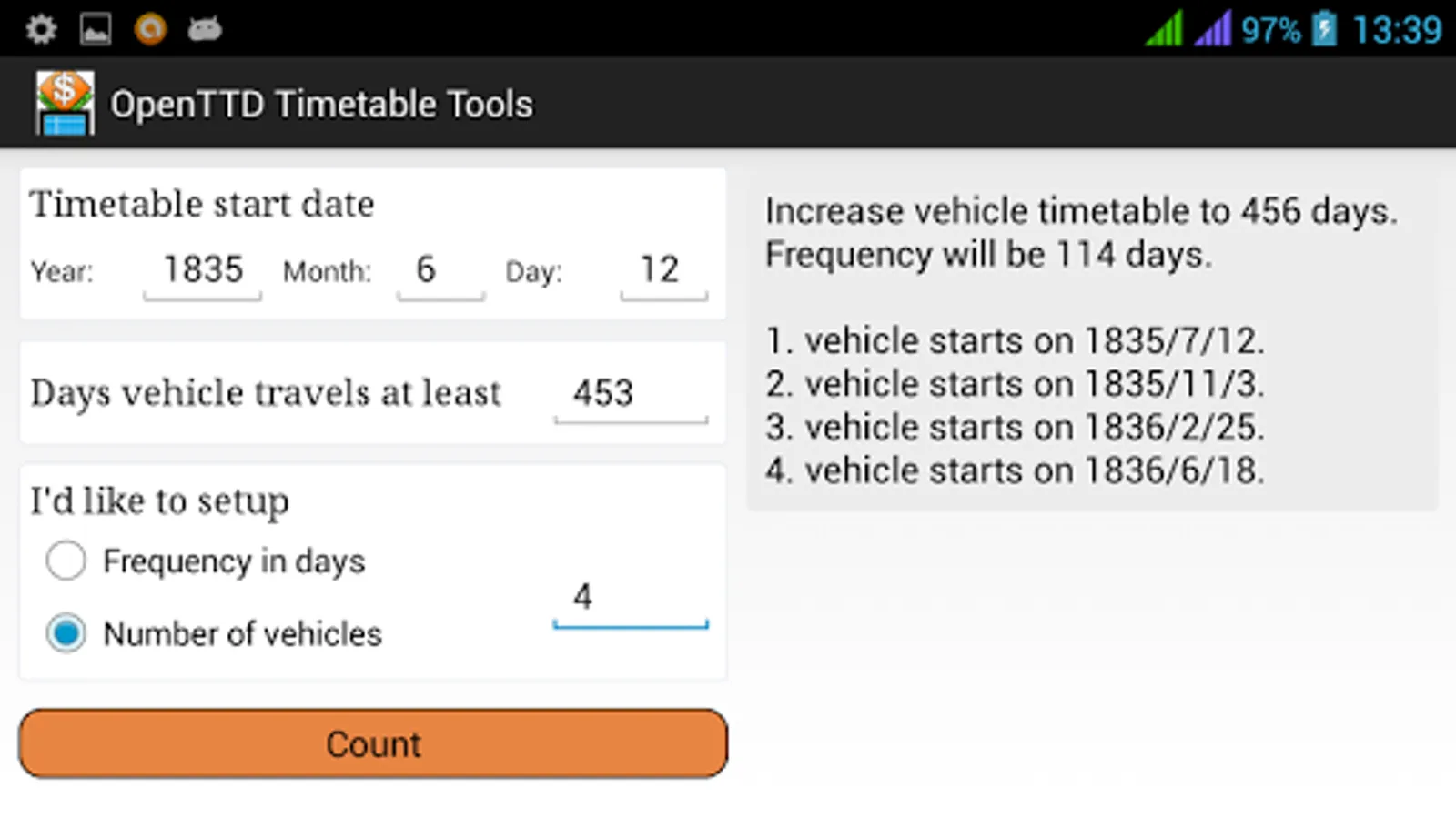 If you like to play OpenTTD with timetables on, you might find this app helpful. OpenTTD Timetable Tools helps you calculate timetable for your vehicles. Enter timetable start date, minimal timetable length and frequency in days or number of vehicles. Program will increase minimal timetable length if neccessary and show timetable start dates for all individual vehicles.