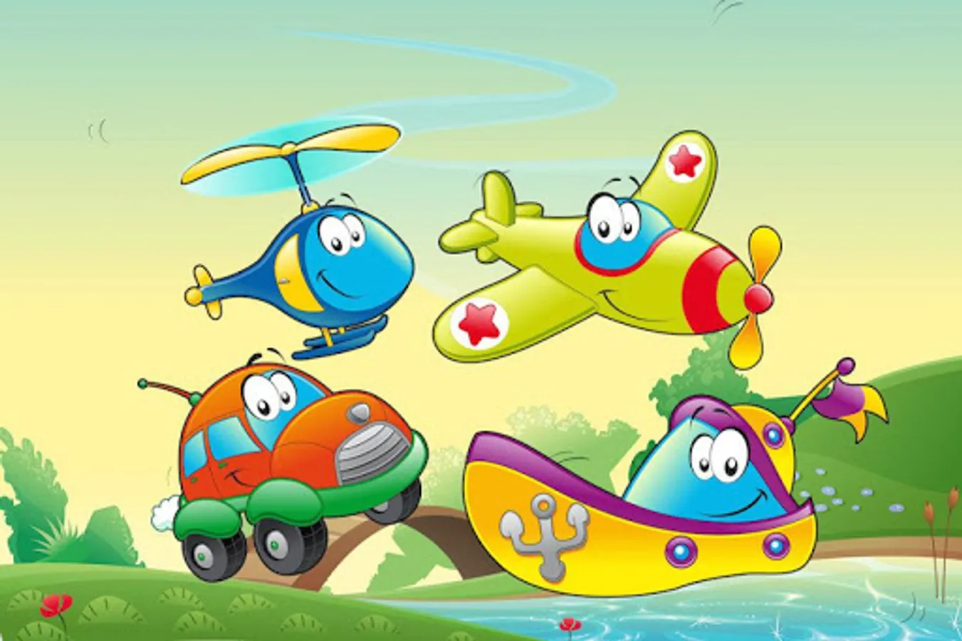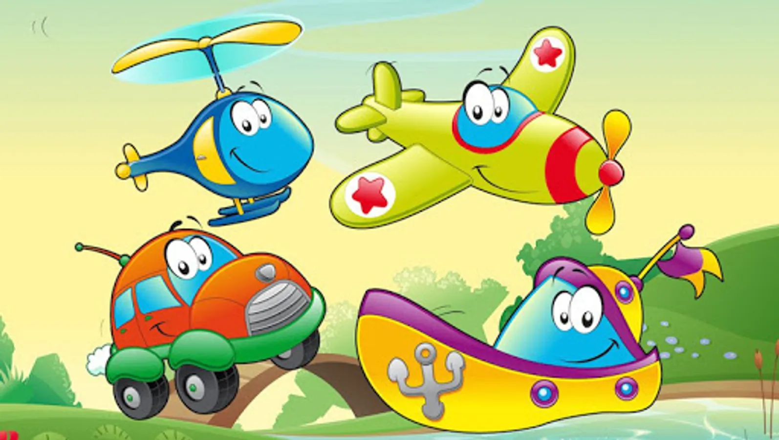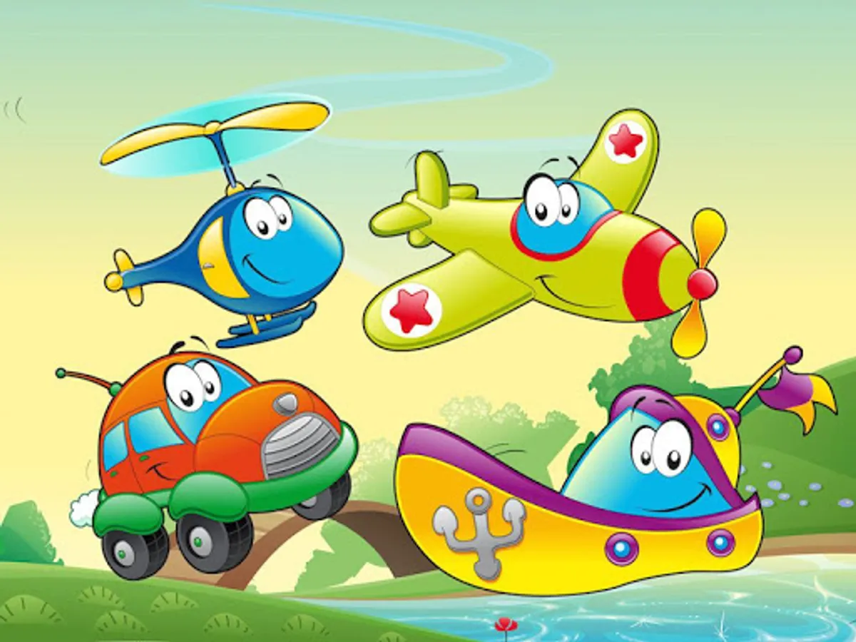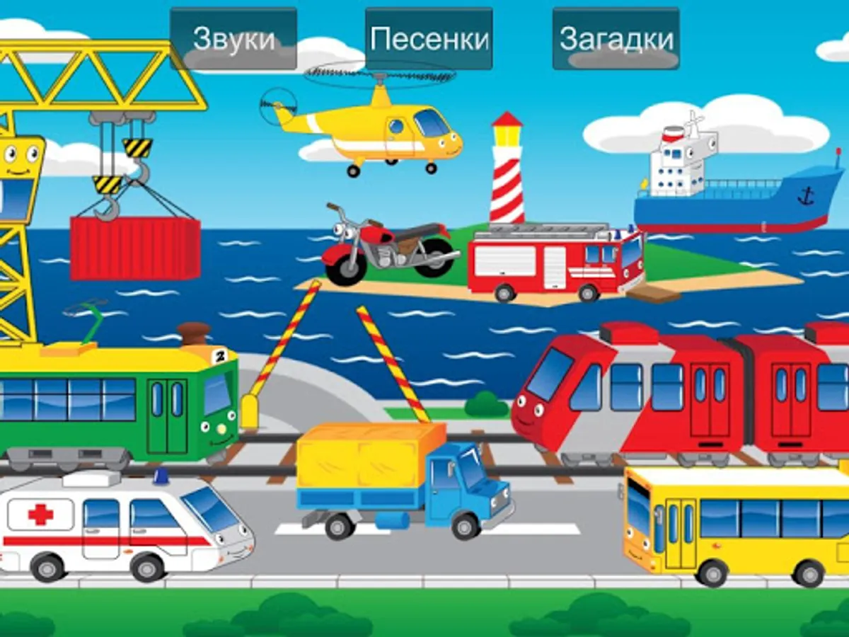 Developing application-game sounds and contains the names of machines, teaching kids transport modes in the game. Obuchalka consists of three sections: