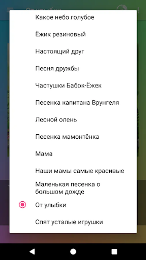 The application contains songs such as "In a box with pencils", a song by a brilliant detective from the movie "Bremen Town Musicians", Song of a mammoth girl and Sleeping tired toys (lullaby).