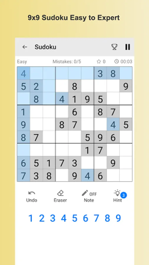 Play Sudoku from easy to expert level. You can relax and keep your brain active when playing. Each sudoku has only one true solution. Take your favourite number game with you wherever you go. Sudoku is available offline. Playing the game on mobile is as good as with a real pencil and paper.