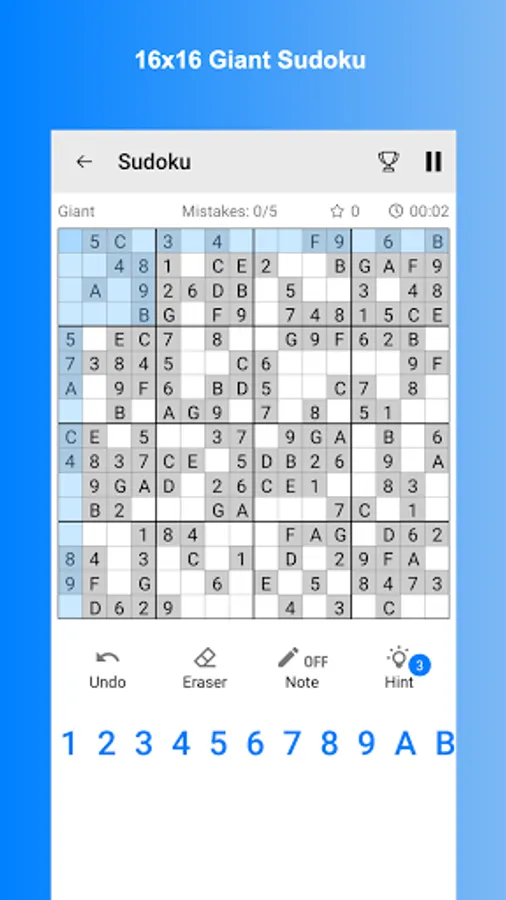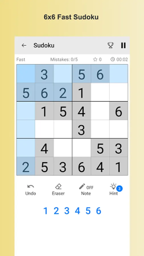 ✓💪 Sudoku puzzles come in 6 difficulty levels: 6x6 fast, 9x9 (easy / medium / hard / expert), and 16x16 Giant.
