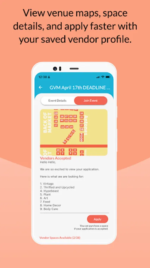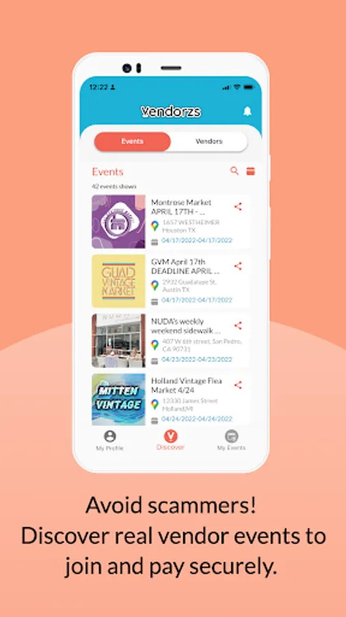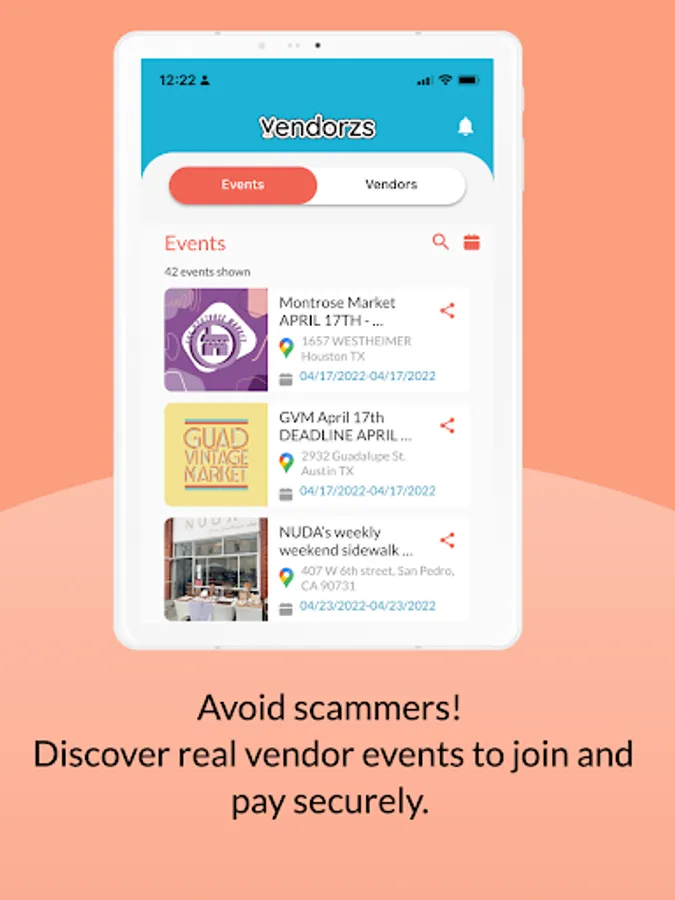 Vendors: Simply find events that you want to join and pay for your event space quickly and securely. Each event will list the kinds of vendors accepted and the price for each space along with a venue map. No more sending funds to randos through Instagram or PayPal. And--our event creators must be legitimate business owners. So you can feel secure parting with your time and money.