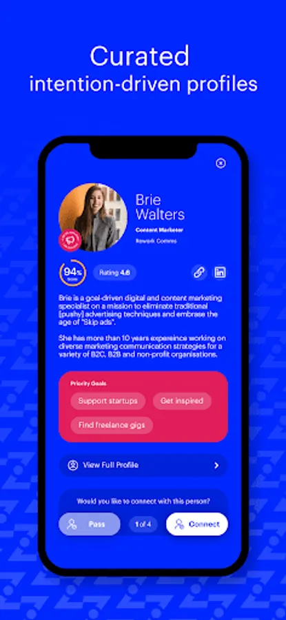 💡 Curated profiles: create your profile through a simple sign-up process and start exploring the curated intention-driven profiles of those around you. See the bio, compatibility score, priority goals and LinkedIn or other socials before deciding whether you want to connect.