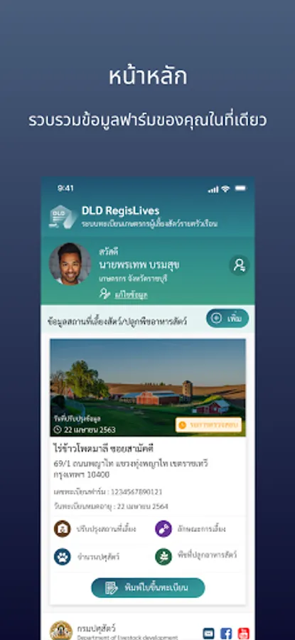 DLD e-Regist application from the Thai Department of Livestock Development is an application for registering, saving, updating Thai farmer registration information, farm information, animal husbandry information. And information on the number of animal species within the farm This application is suitable for farmers and staff for recording and keeping the update history of Thai farmers.