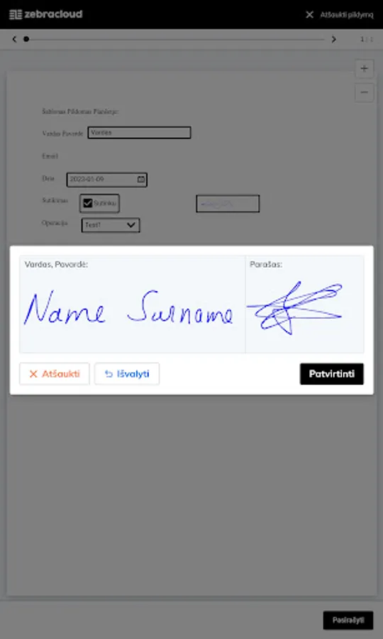 Ši programėlė leidžia Zebracloud platformoje sukonfigūruotus elektroninius dokumentus užpildyti reikiamais duomenimis ir saugiai pasirašyti.