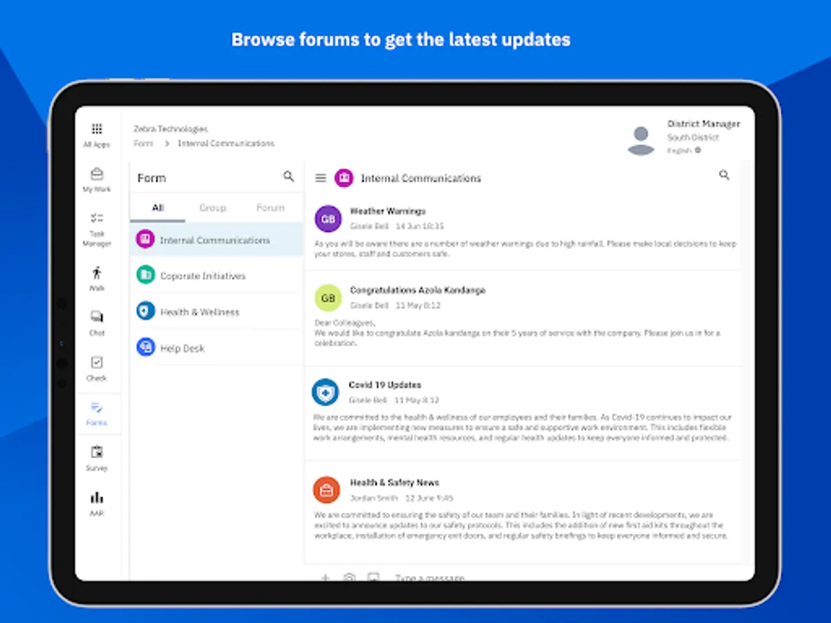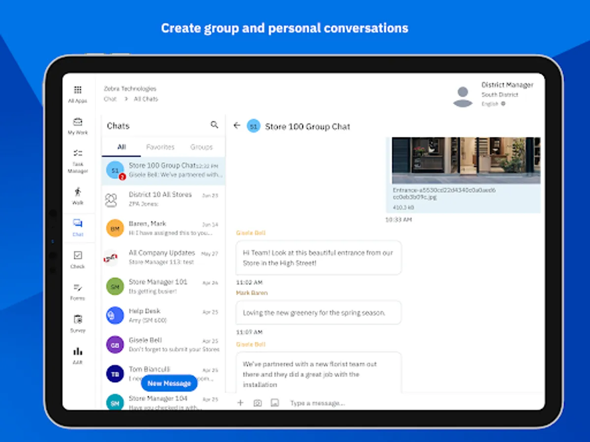 Zebra Workcloud Chat: A peer-to-peer (P2P) real-time chat system embedded in Workcloud Comm that allows personnel to send real-time messages within your organization. Chat allows for quick, targeted and messaging within a controlled, safe environment. Create group and personal conversations and leverage multimedia messaging to include images and emojis without any difficulties.