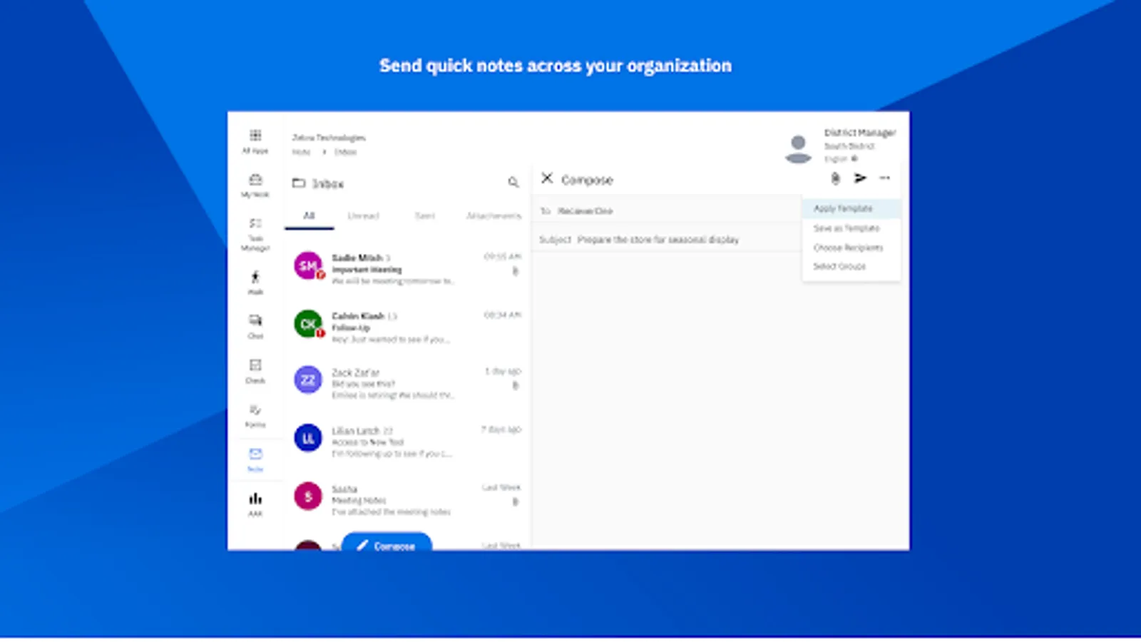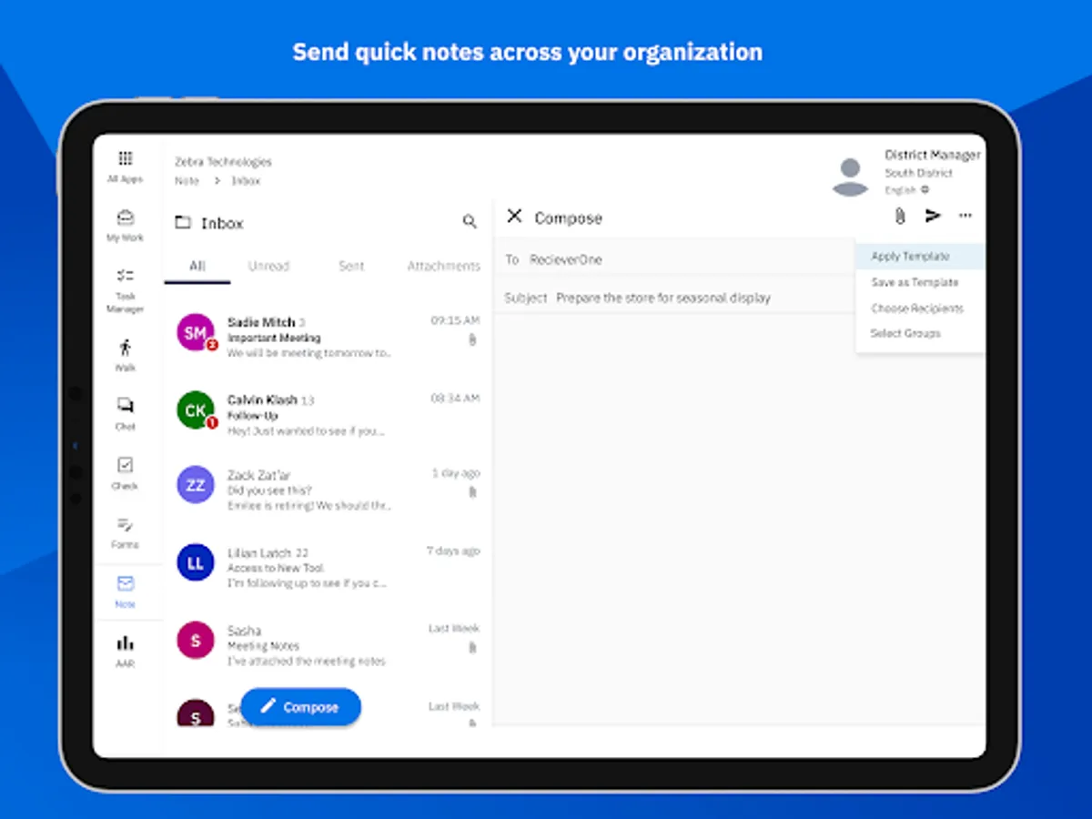 Zebra Workcloud Note: A peer-to-peer (P2P) messaging system embedded in Workcloud Comm that allows field managers, store managers, and corporate personnel to send quick notes within the organization. Note facilitates quick, targeted messaging without the complications and privacy issues of many communication platforms. Attach pictures and documents to help your team communicate and collaborate more efficiently.