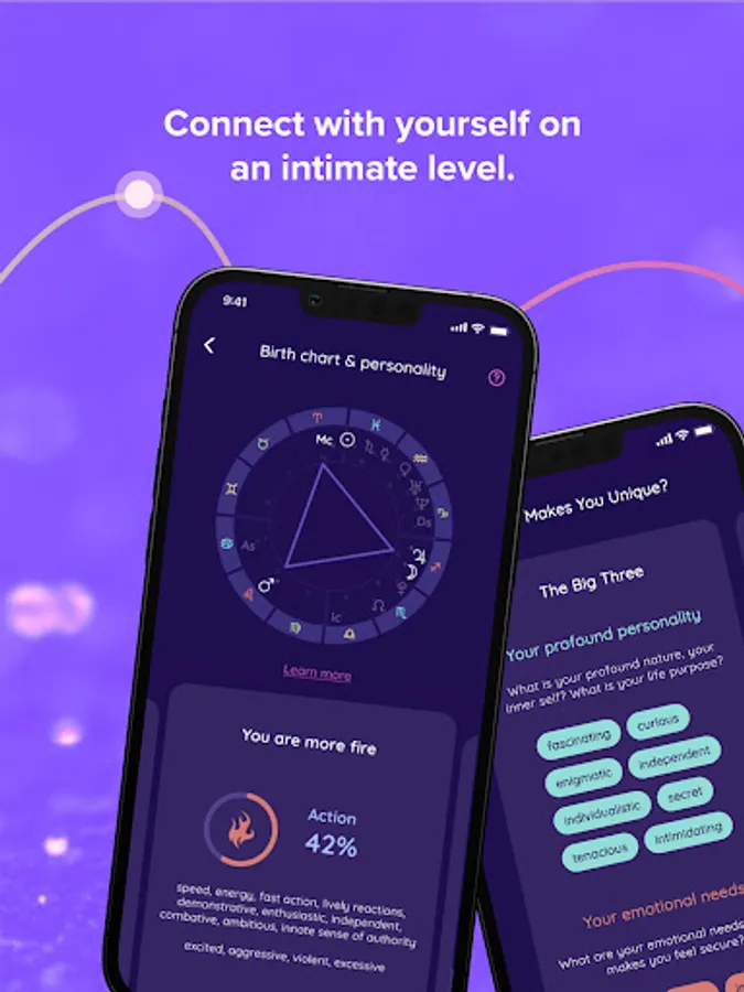 - Your Charts: You can see your Natal Chart and the real-time transit for both the Whole Sign House System and Placidus House System.