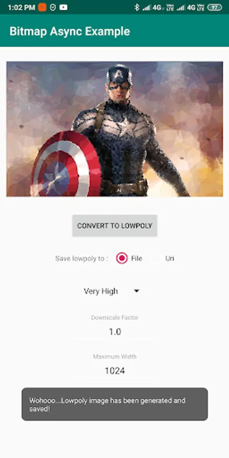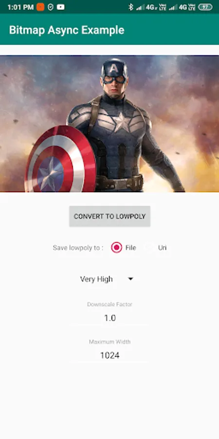 This app provides an example implementation of the RxLowpoly library which can be found at https://github.com/abhriyaroy/RxLowpoly, showcasing it's various modes and quality configuration and usage.
