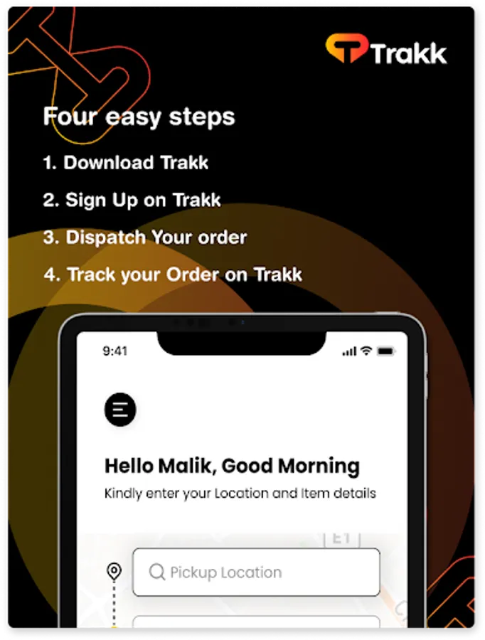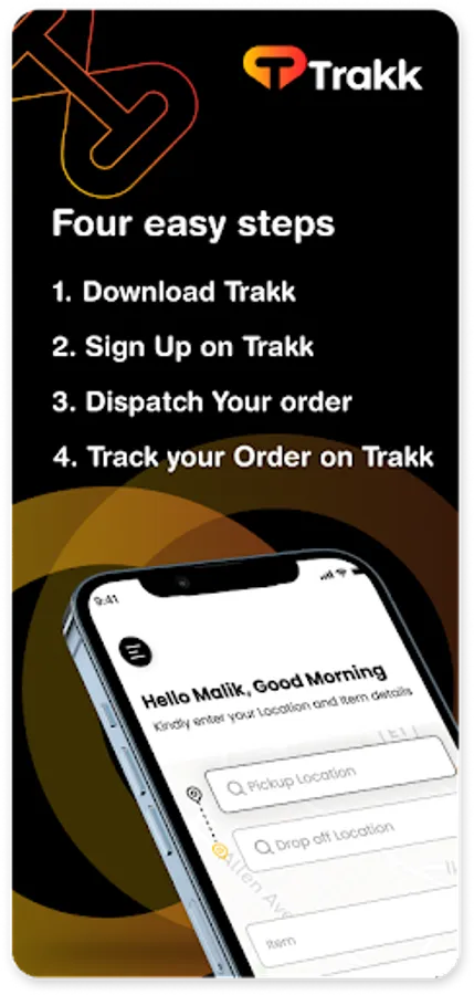 Trakk is easy to use - Sign-up, Order a dispatch, Track your order, and Rider delivers.