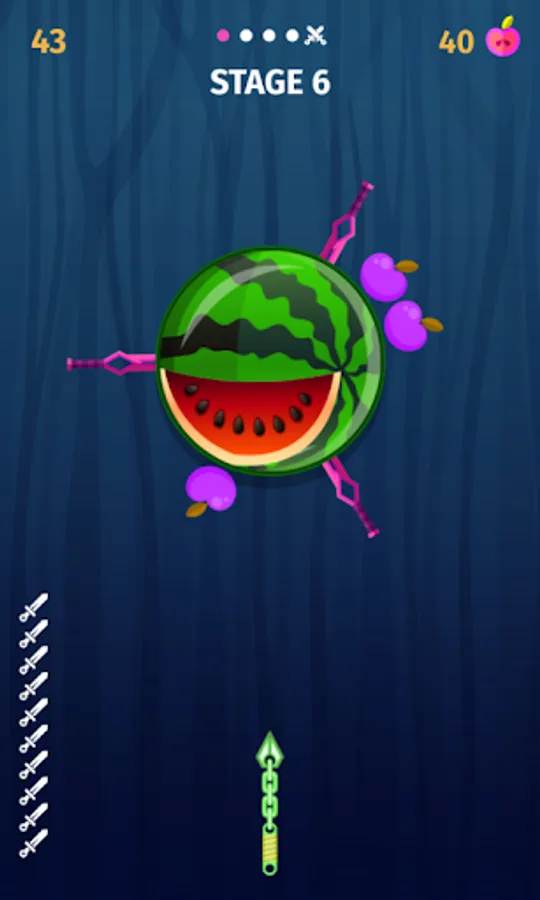 To shatter the objects, throw the knives into them. Slash the apples to gain access to new knives. A boss guards each fifth stage; defeat them to get special knives!