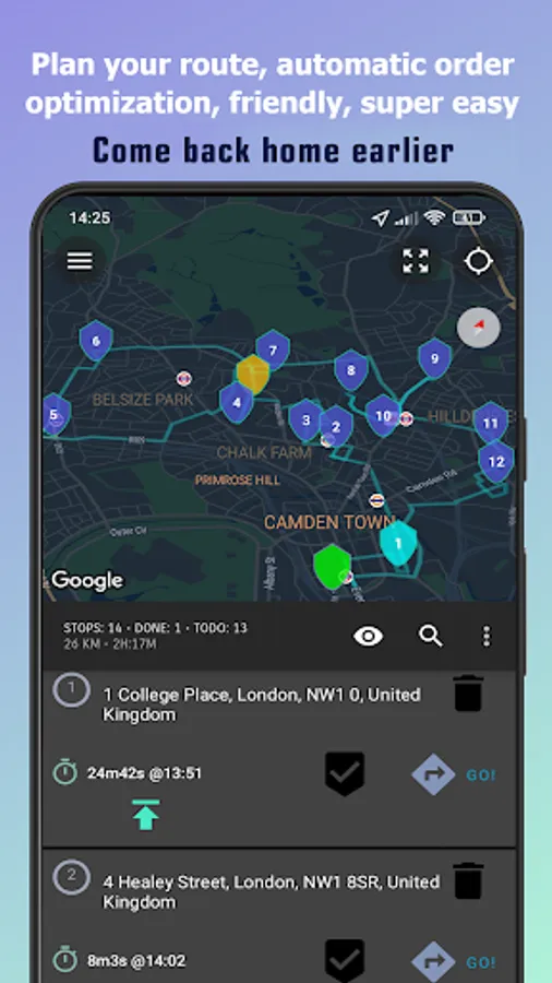 Once the list of multi stops deliveries has been added by voice, autocompletion, Excel/GPX files or images, the app manages all the rest. It will decide the order of multi drops that avoids traffic, prevents you from returning to the same area multiple times and will make you finish the delivery route as quickly as possible.