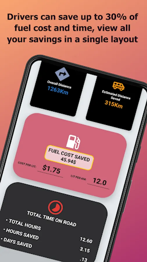 Check your savings in a new statistics layout, you will see distance, hours and fuel cost saved during the route because less driving on the road = less petrol used = money in your pocket!